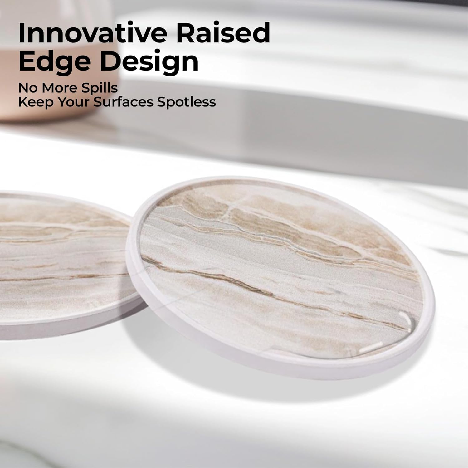 - Innovative Raised Edge Design: Prevents spills and contains condensation effortlessly, keeping your surfaces clean and protected. Combined with absorbent ceramic material, it offers both practicality and elegance for everyday use