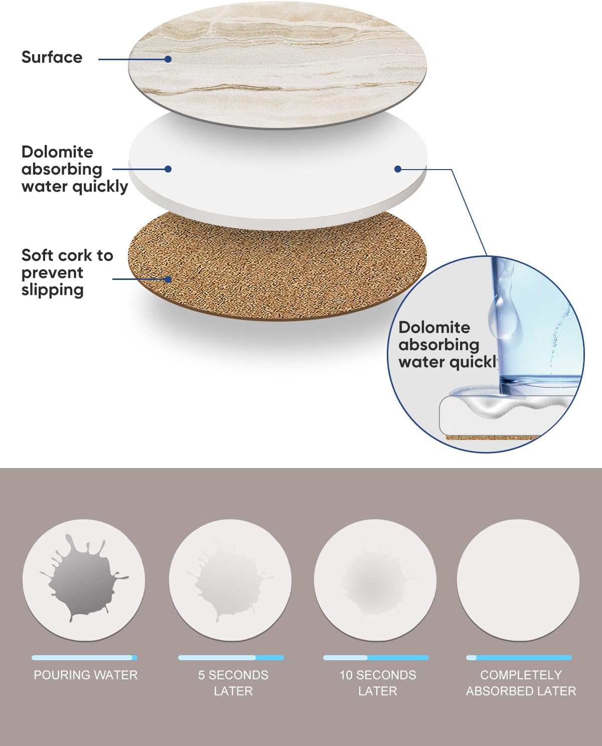 - Non-Slip: Stone coasters equipped with a cork backing to prevent slipping, it stays securely in place on any table. Unlike silicone, fabric, or other materials, the ceramic surface holds cups steady, ensuring stability for different types of drinks
