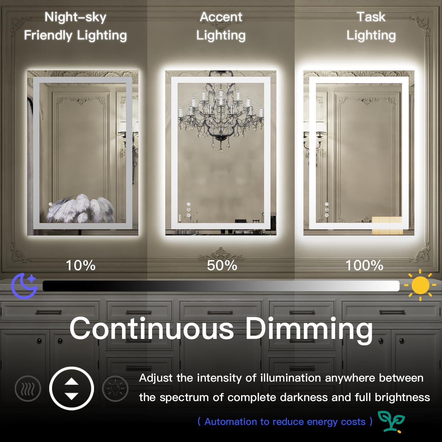 - 3 LITTLE CONTROL BUTTONS MAKES THE BATHROOM HIGH-TECH - ①Waterproof and fogless as a defogger, and will automatically turn off after 1 hour. ②Change the color temperature between 3000 K to 6000 K the intensity and proper room coloration is easily achieved. ③ Adjust the brightness up and down to say goodbye to traditional wall-mounted lights. ④Built-in smart memory function with brightness setup will be remembered for your next use when it is controlled by wall switch.