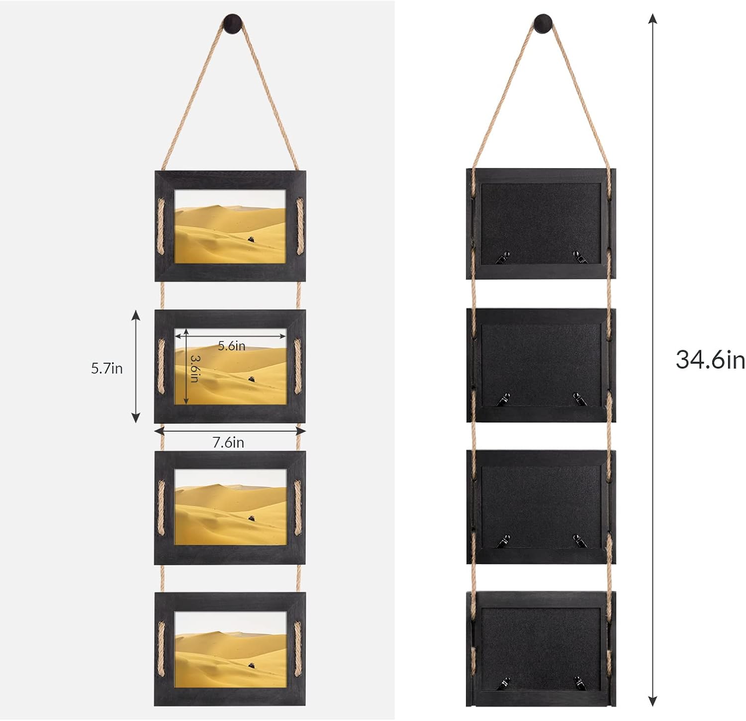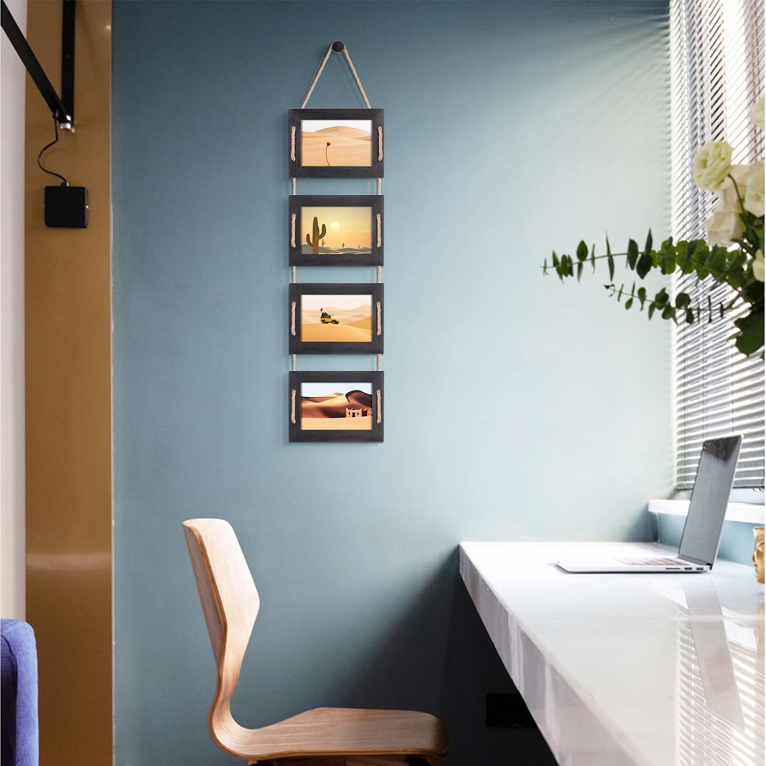 DLQuarts 4x6 Hanging Collage Picture Frames Wall Decor, 4-Opening 4x6 Photo without Mat Rustic Wood Frame with Hemp Rope, 1 Pack, Weathered Black