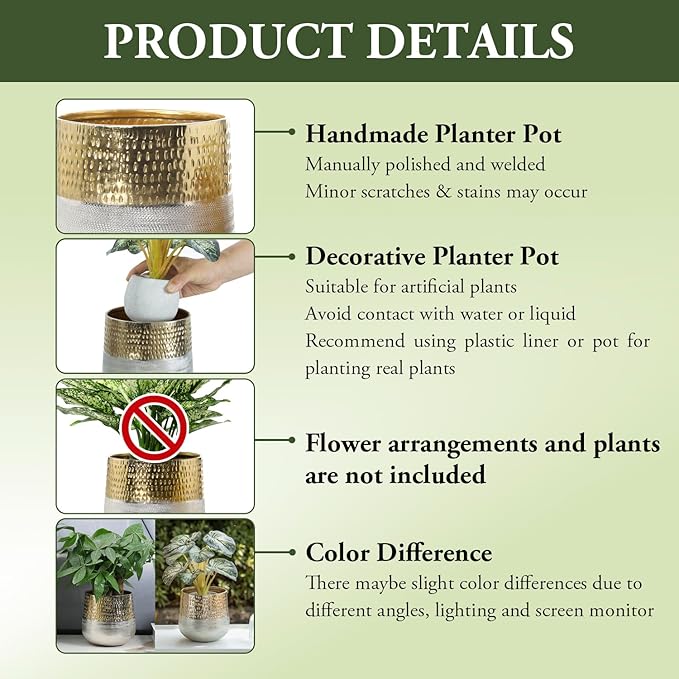 MyGift Round Two-Toned Indoor Planter Pot, Hammered Brass and Milled Embossed Silver Tone Metal Planter Vase, Set of 2 - Handcrafted in India