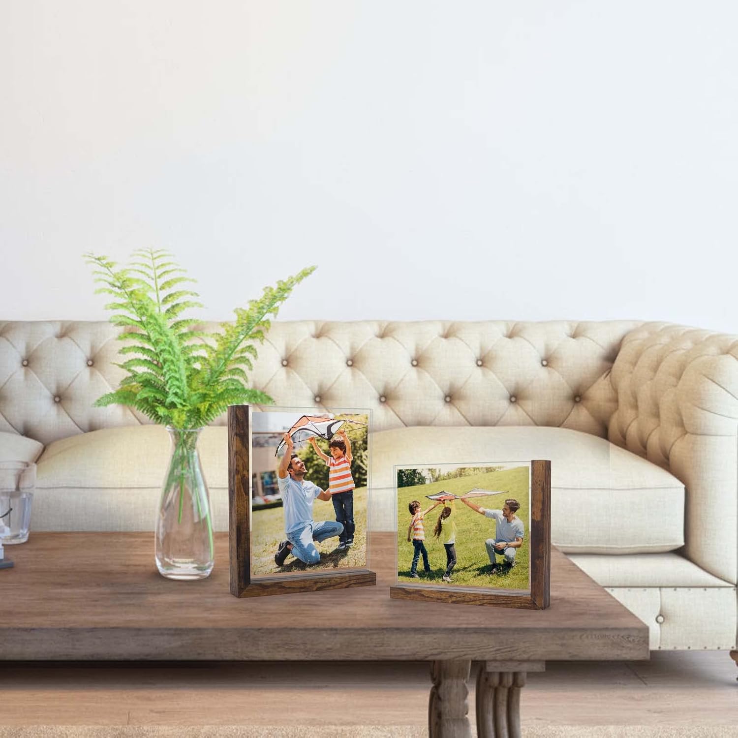 - FRAMELESS DESIGN: The 8x10 double sided picture frame has HD tempered glass and the frameless design allows you to easily take out the glass and change the photos in it. You can place it in the office, bedroom, dining room, living room, coffee shop.