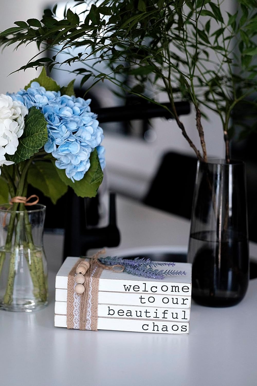 - 🎶【WELCOME TO OUR BEAUTIFUL CHAOS】-A set of 4 wooden books made from real wood, painted with premium chalk paints, wrapped in jute rope and finished with faux greenery and wood beads detail. A perfect accent piece for anywhere in your home!