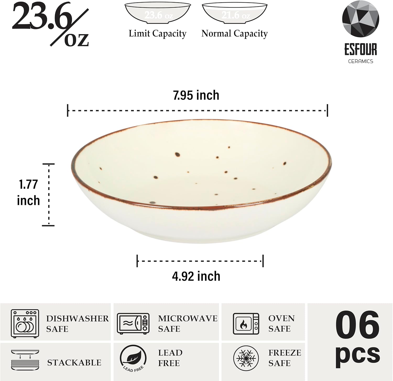- Pasta Bowls Set of 6: Esfour pasta bowls come with 8", 23.6 Oz, 2" depth. Perfect as pasta serving bowls, suitable for pasta, spaghetti, dinner salad, soups, morning cereal, stir-fries, seafood, main meal, rice, or broccoli. Large enough to never worry about spillage. Stir fries, seafood, main meal, rice, or broccoli. Anything with a bit of liquid or sauce can be served in these salad bowls.