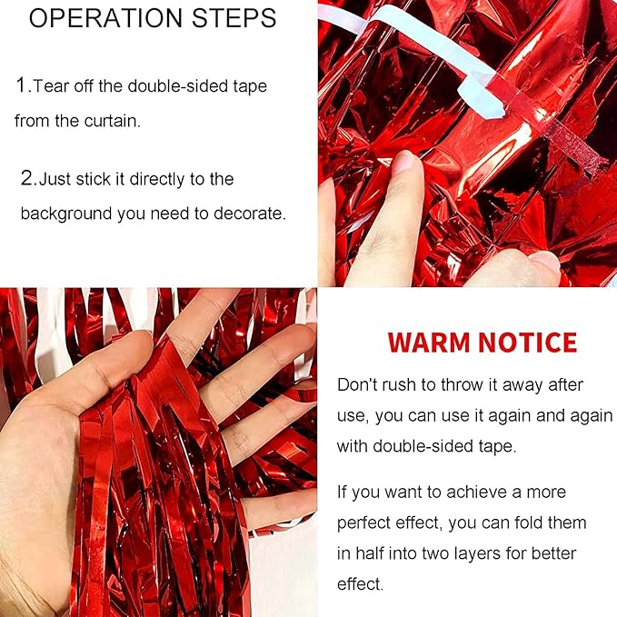 - The size of each metallic tinsel foil fringe curtain is 3.28 feet wide and 9.84 feet long, Package include 4 pack foil fringe curtains, suitable for hanging on a door or coverage a wall fully.