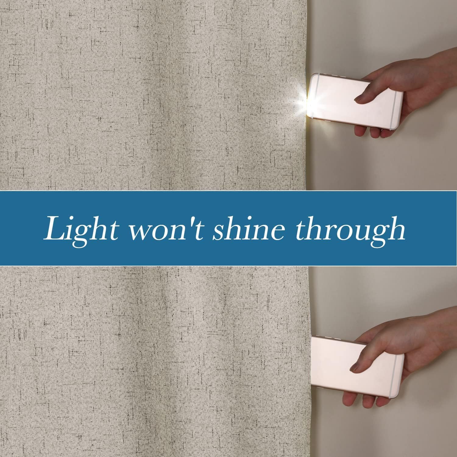 - 100% BLACKOUT: These elegant faux linen curtain is passed GLOBAL RECYCLED STANDARD certificate, has white color lining on backing, definitely can block out 100% bright sunlight and UV ray, turn day into night, just enjoy your sweet sleeping and protect your furniture from color fading, providing entire privacy in your place