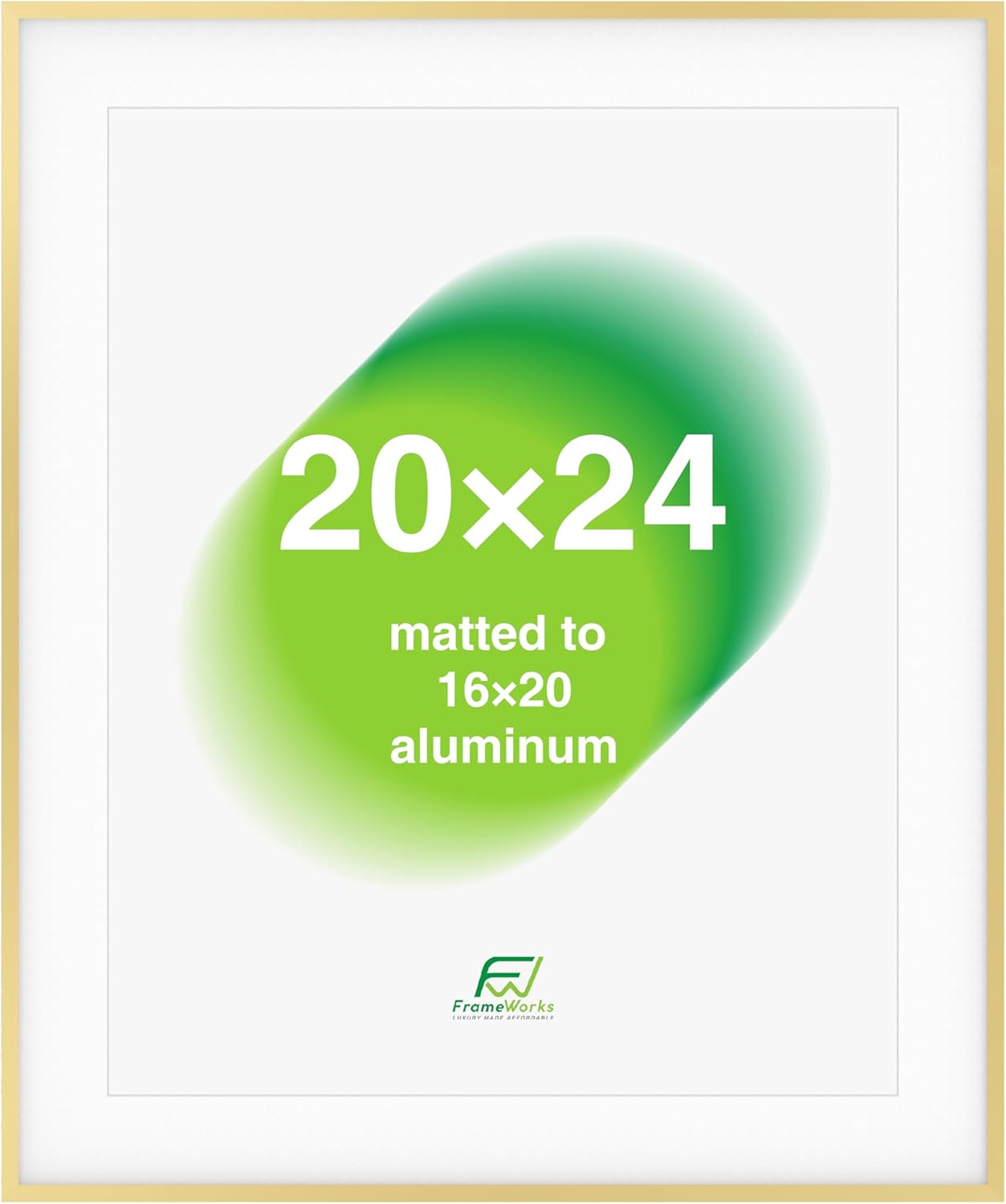 FrameWorks 20x24 Matted to 16x20 Picture Frame – Aluminum Frame w/Tempered Glass, Removable Mat for Photos, Posters, Art, Stylish Wall Frame for Home Decor, Gallery Walls, Office, Living Room - Gold