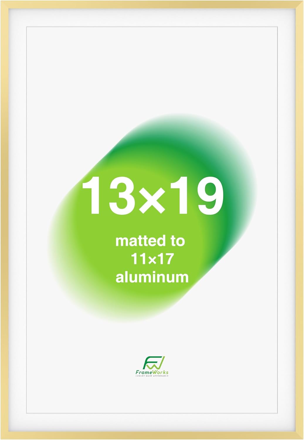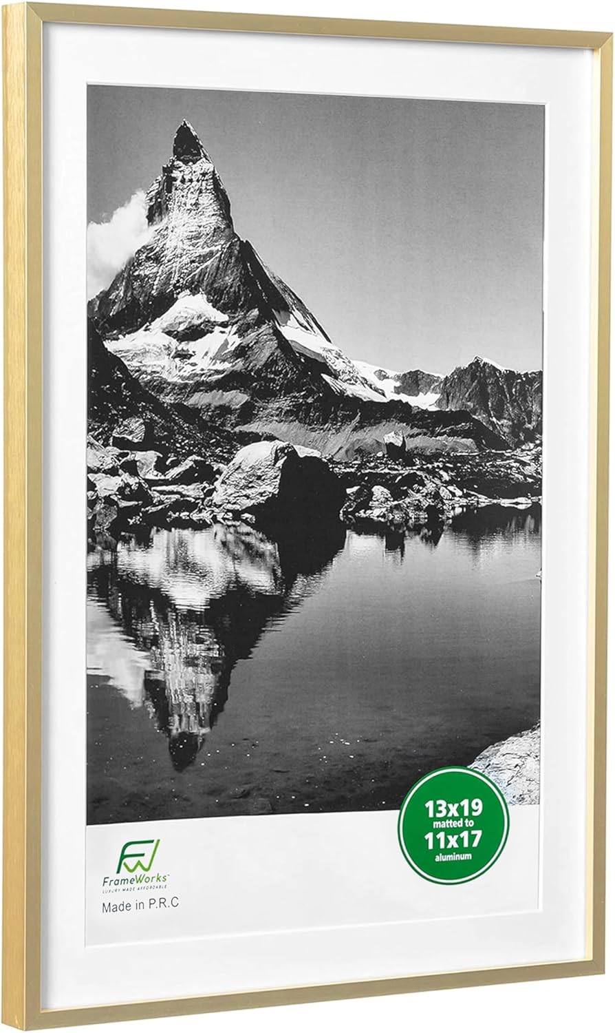 FrameWorks 13x19 Matted to 11x17 Picture Frame – Aluminum Frame w/Tempered Glass, Removable Mat for Photos, Posters, Art, Stylish Wall Frame for Home Decor, Gallery Walls, Office, Living Room - Gold