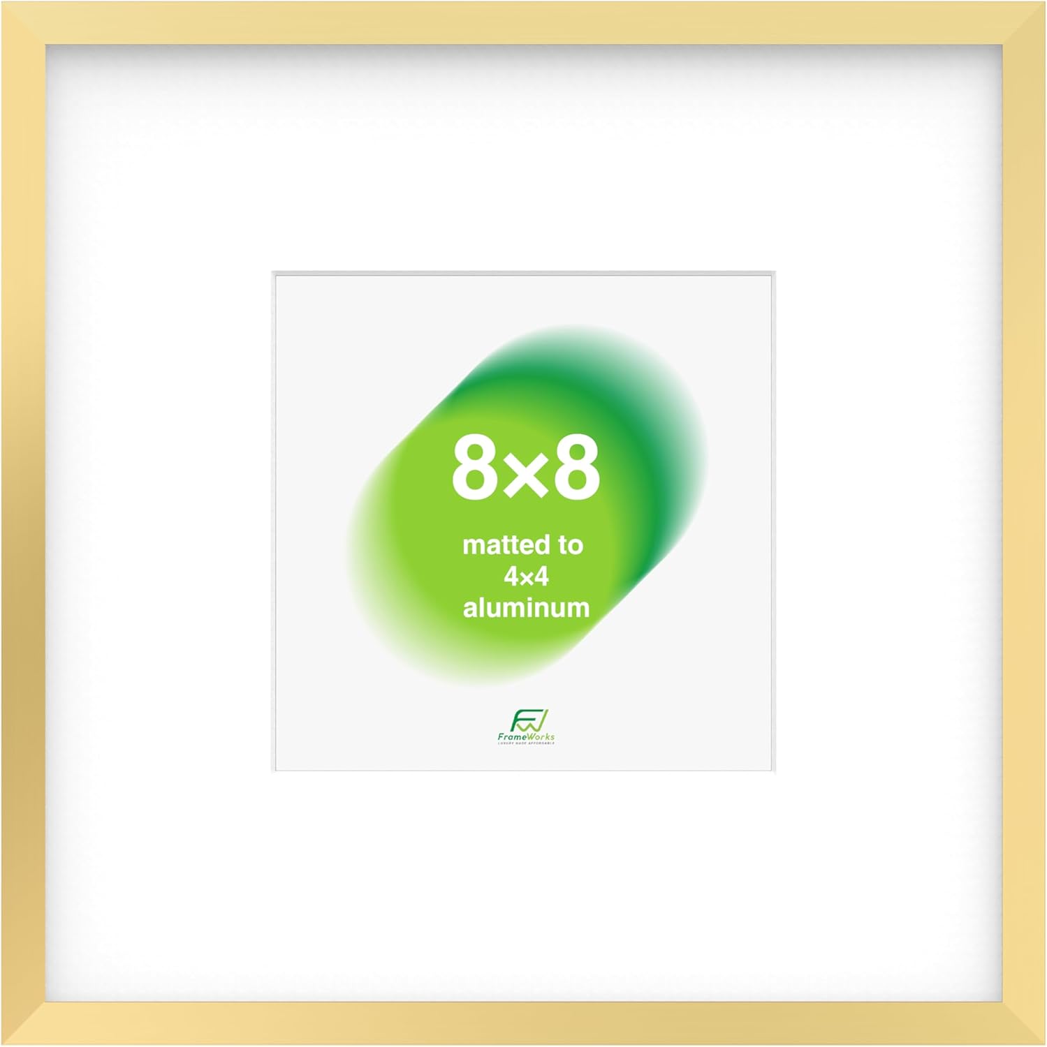 FrameWorks 8x8 Matted to 4x4 Picture Frame – Aluminum Frame w/Tempered Glass, Removable Mat for Photos, Posters, Art, Stylish Wall Frame for Home Decor, Gallery Walls, Office, Living Room - Gold