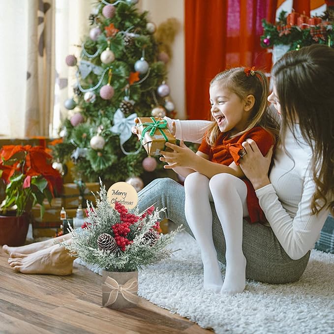 - This 2024 small Christmas tree is made of high-quality artificial pine needles, berries, pinecones and round wood chip with blessing. It has aCountry style base with bows, which is firm and fashionable.