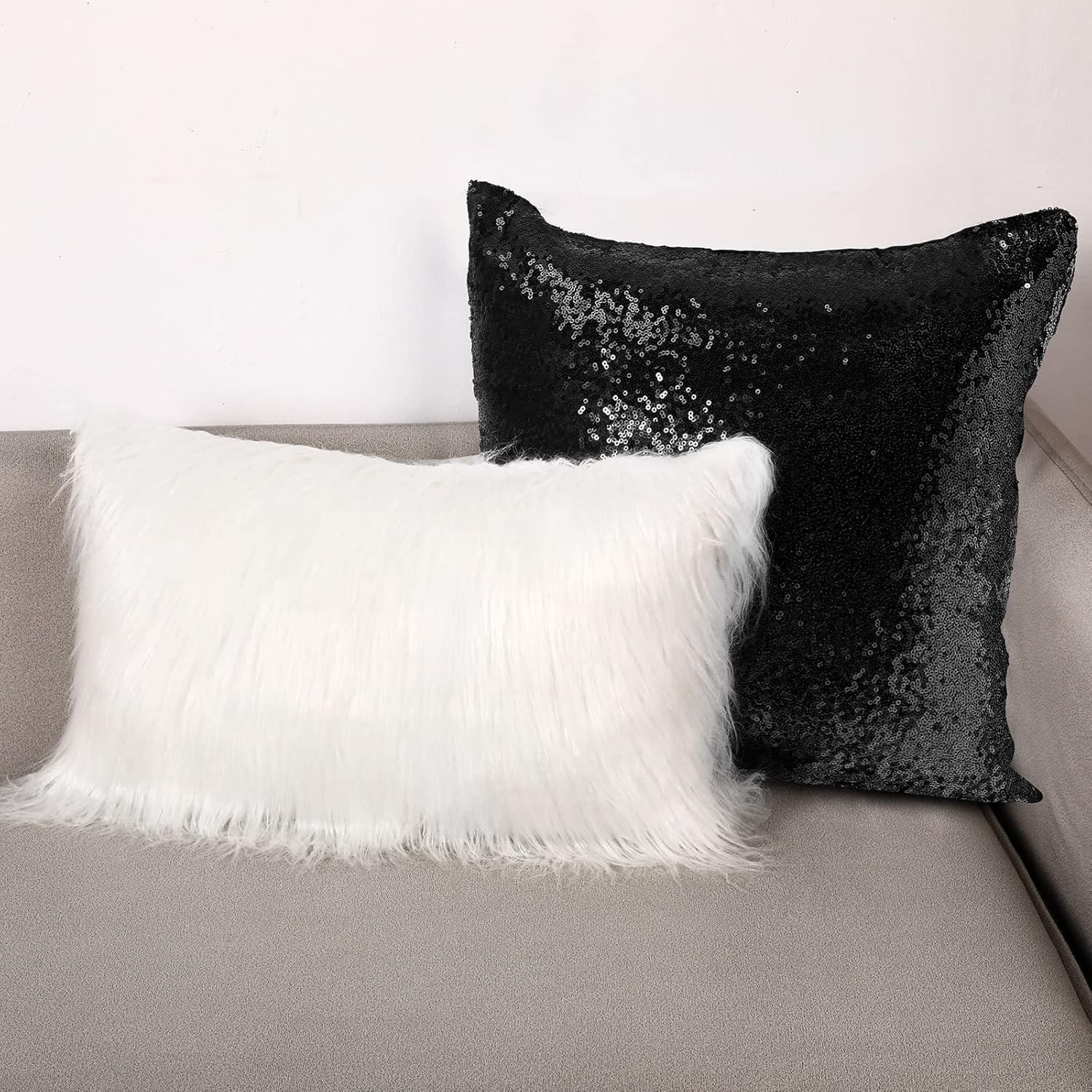 Irenare 4 Pcs Sequin and Fluffy Pillow Covers Winter Throw Pillow Cases Soft Cushion Cover for Couch Bed Sofa Xmas Day(18 x 18 Inch, 12 x 20 Inch,White, Black)