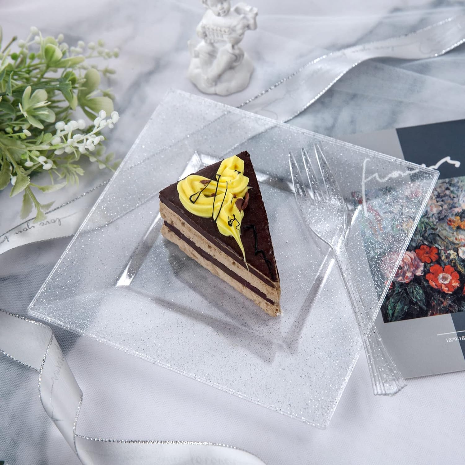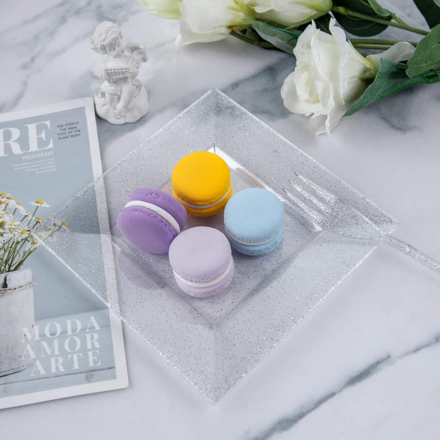 DaYammi 100 Pcs Plastic Dessert Plates 6" with 100 Pcs Plastic Forks 5.7"- Silver Glitter Disposable Square Plate Fancy Salad Plate Appetizer Plates and Silver Forks Combo Bulk Set for Wedding Party