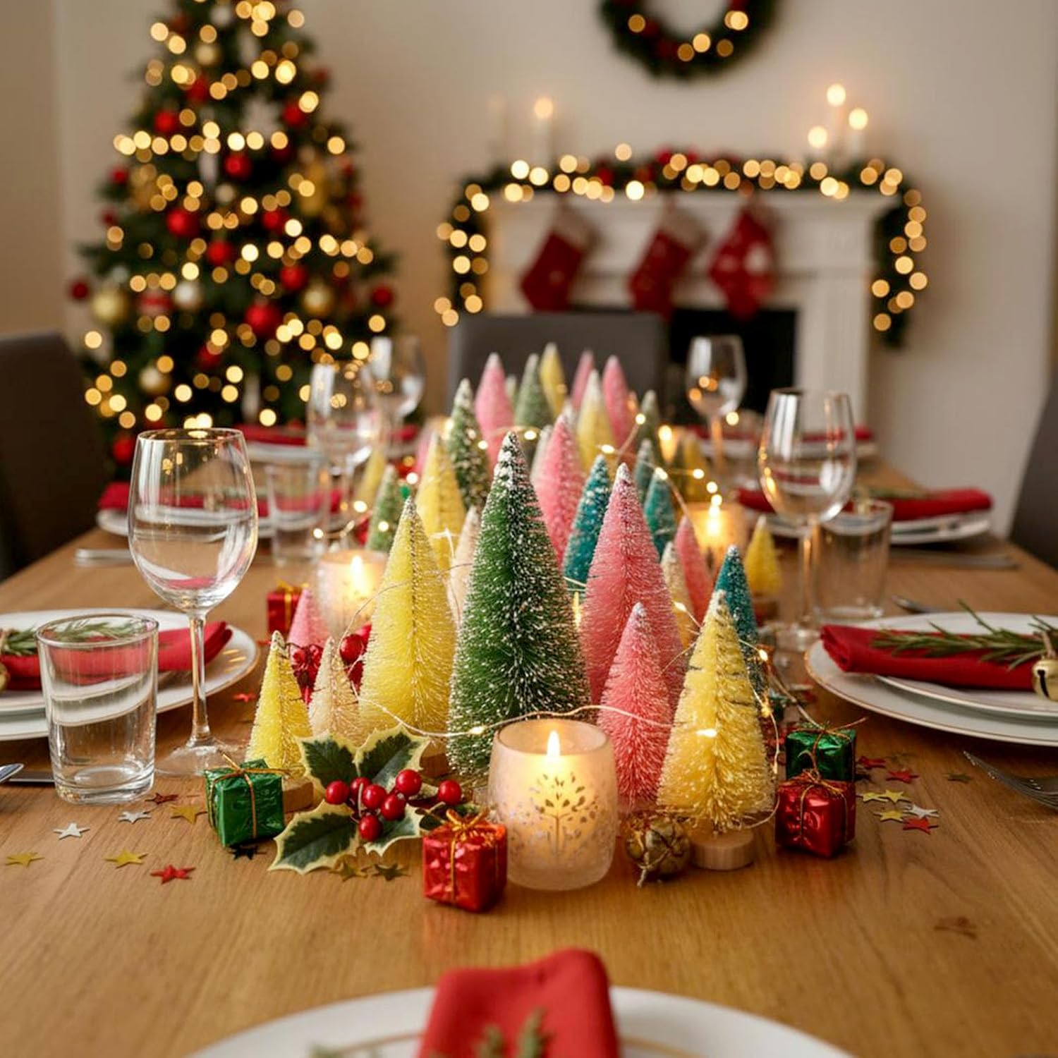 LOVEINUSA 40PCS Colorful Mini Christmas Trees, Snow Frosted Sisal Trees Colored Bottle Brush Xmas Trees with Wooden Base for Xmas Winter Home Table Decoration