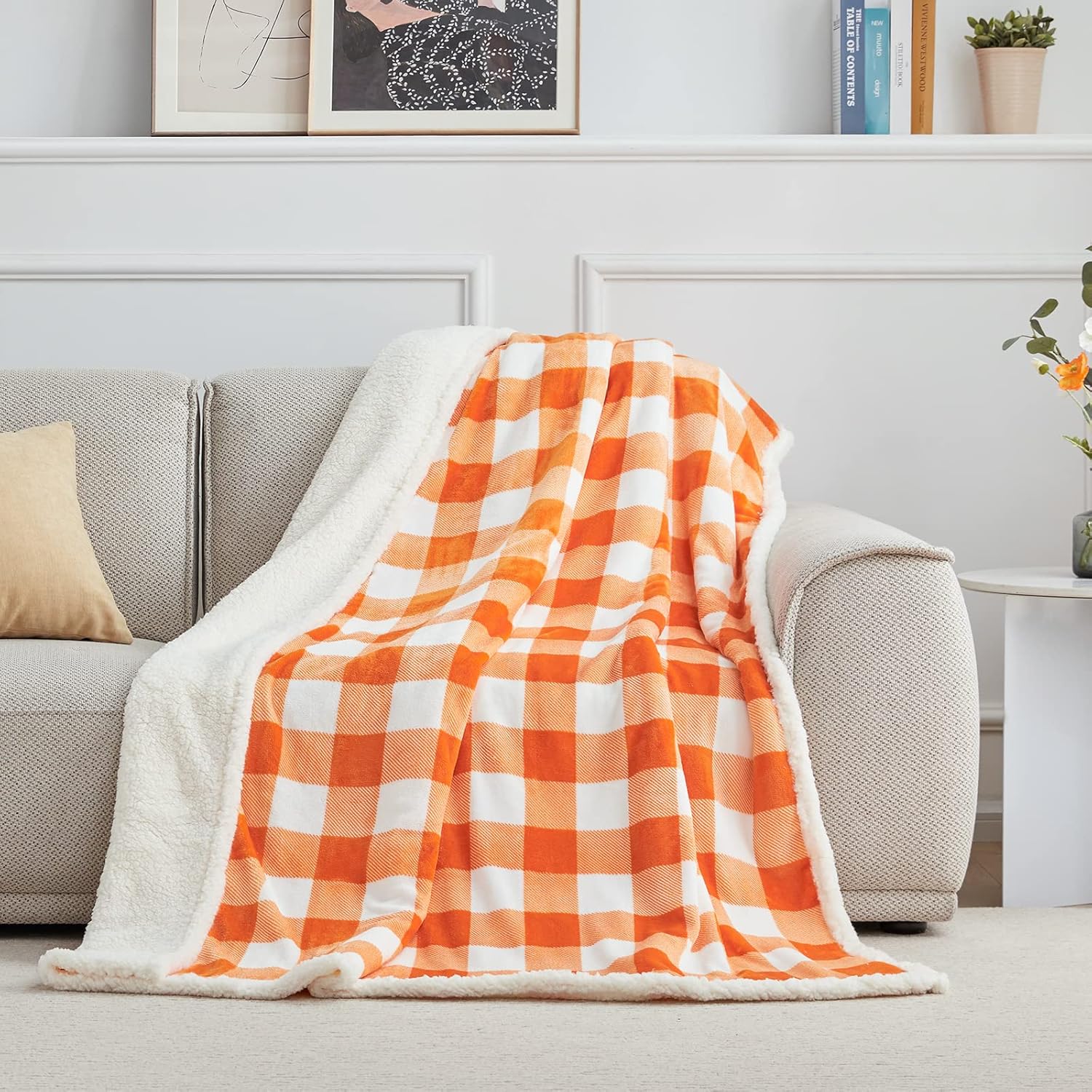BEAUTEX Sherpa Fleece Fall Throw Blanket, Super Soft Warm Buffalo Plaid Plush Blankets and Throws, Lightweight Cozy Fuzzy Blanket Fall Decor for Couch Sofa Bed (Orange, Throw 50" x 60")