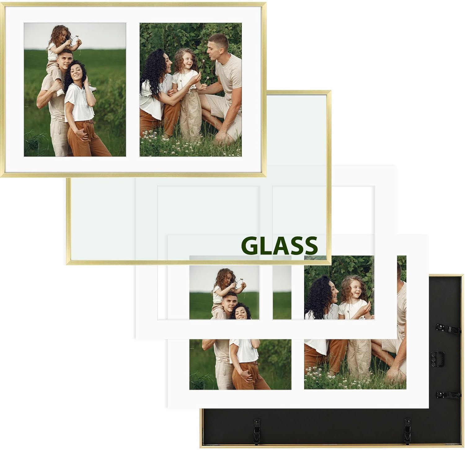 Frametory - 12x19 Aluminum Collage Picture Frame - Display 8x10 Pictures with 2 Openings Mat - Real Glass Front - Horizontal/Vertical Wall Mount - Gold 1 Pack