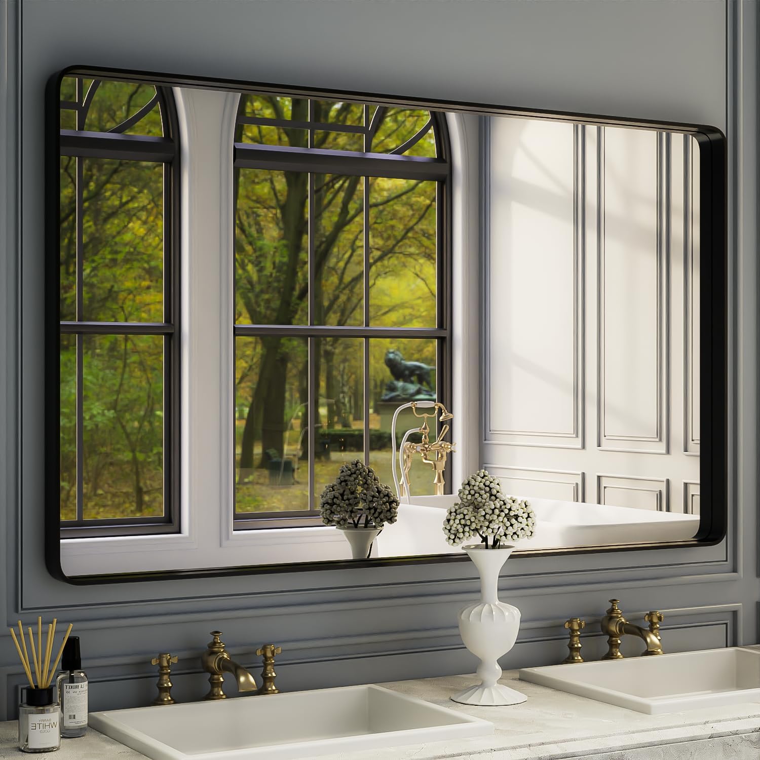 ISKM Large Black Framed Mirror for Bathroom 60" x 36" Wall Mounted Mirror Black Metal Framed Bathroom Mirror for Wall Round Corner Hangs Horizontal Or Vertical