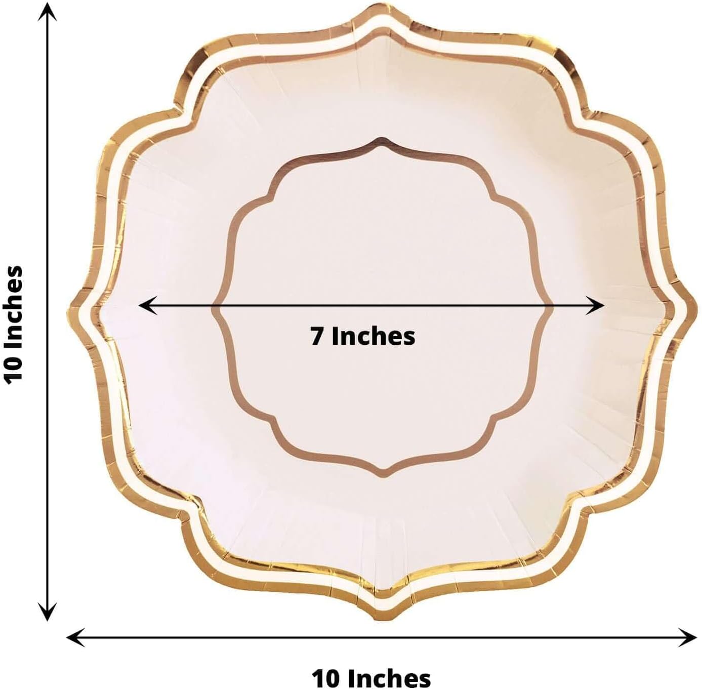 - 25 Pack of 10 Inch Plates: Each plate is designed with a classic white surface and a shimmering gold scalloped rim, crafted from 300gsm premium paper to present main courses elegantly at cocktail parties, weddings, and formal receptions.