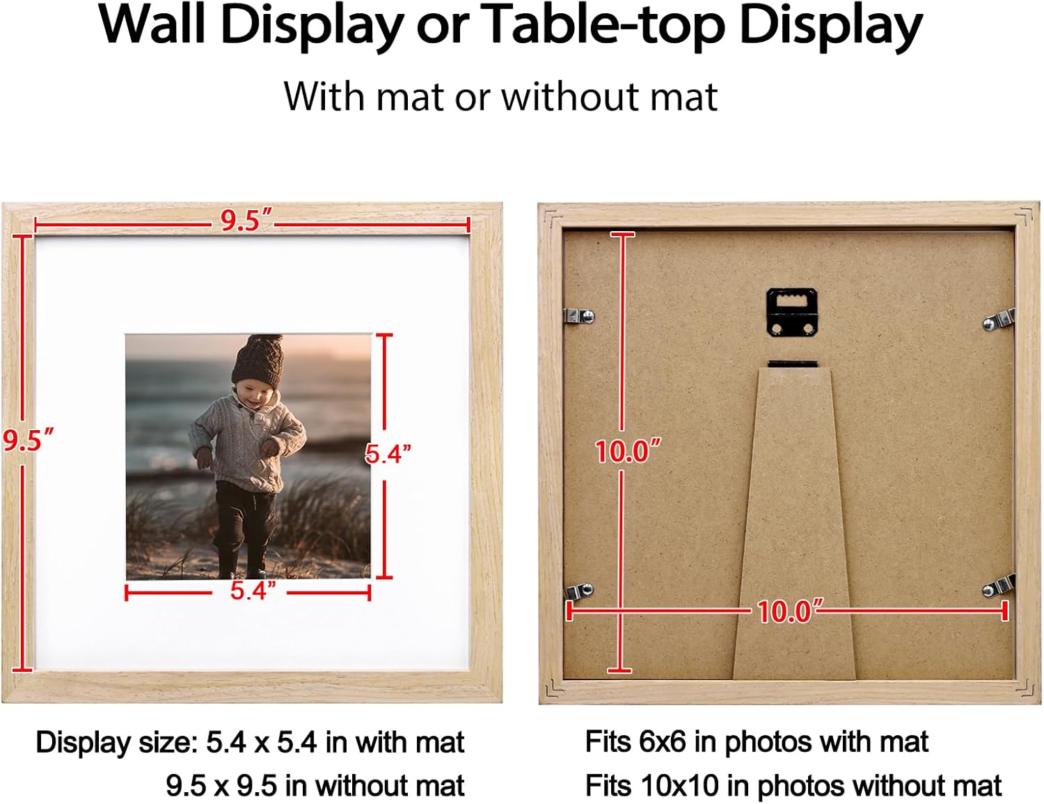 - SOLID WOOD: Kinlink square 10x10 wood frames are fitting for pictures 6x6 with mat and standard pictures 10x10 without mat. Natural wood 10x10 frames are made of high-quality light weight solid wood with transparent acrylic glass front that gives a clear view of your picture and preserves your precious memories as well. It is worth noticing that remove the protective film on the glass before use.