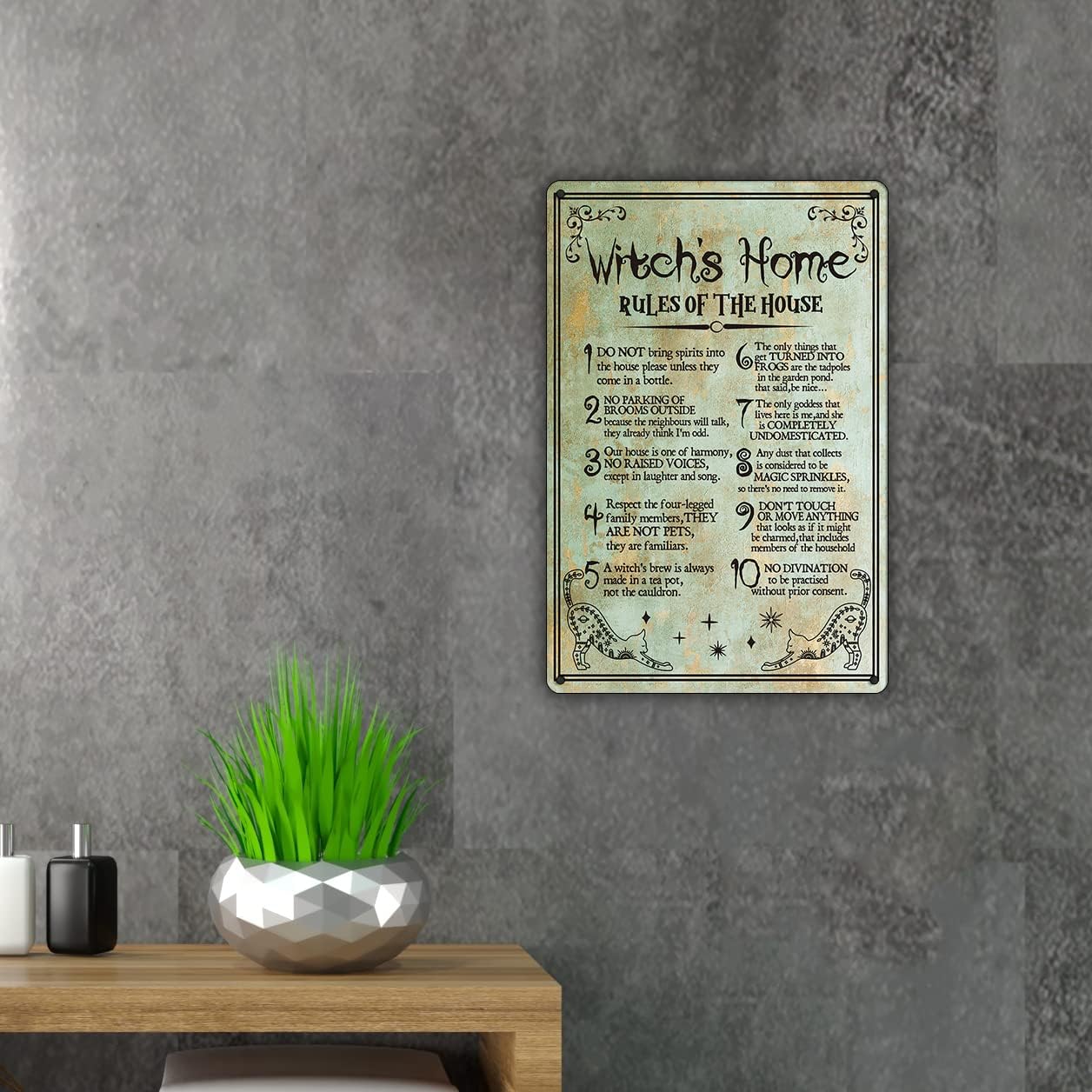 Funny Witch's Home Rules Quote Metal Tin Sign Wall Decor, Retro Do Not Bring Spirits into the House Sign for Home Decor Gifts