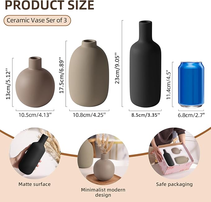 - 【Multipurpose】this three-piece ceramic vase set can be placed individually as japandi home decor, neutral home decor, living room decoration, bedroom decor,tabletop decoration, bookshelf decoration, storage rack decoration, mantelpiece decoration, entryway decor,dining room decor, minimalist side table decor and can also be dried flowers vase,Pampas grass vase,etc.
