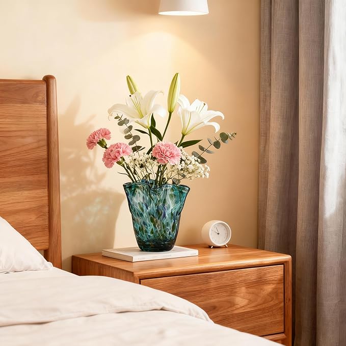 Hand-Blown Glass vase, Green Wide-Mouth Petal-Shaped vase, Modern Glass Art Decoration, Ideal for Living Rooms, Kitchens, Weddings, Dining Tables, and Office Centerpiece Floral Arrangements.