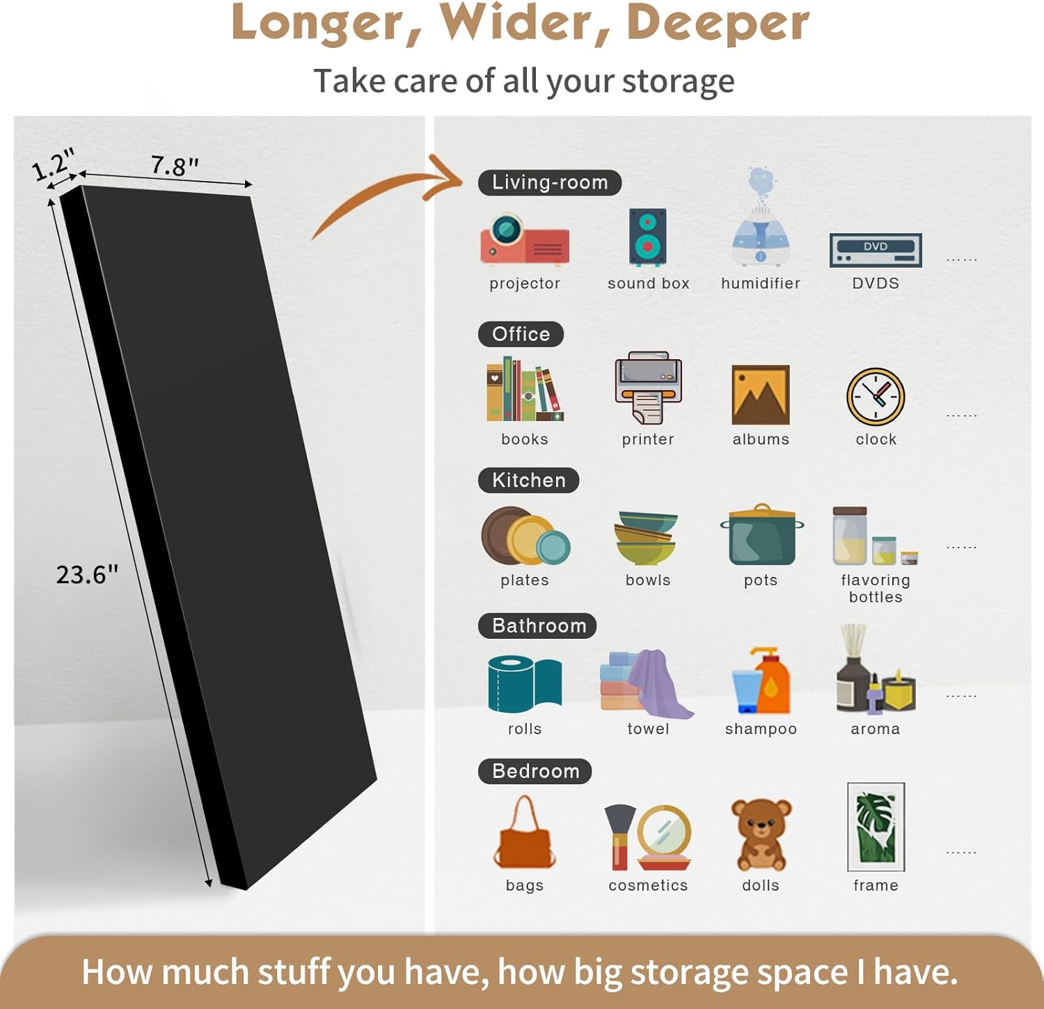 - 【Longer & Wider & Stronger】The clean, classic design of 24 Inch Long floating shelves fixed with hidden durable dual-pipe iron bracket stable and bearing weight capacity up to 20 lbs. Each board are same size at 23.6" L x 7.8" W x 1.2" H. Hanging 2 or 3 of them in a line as extra-long 48 or 72 inches long floating shelves. The floating Shelves black color finish make a perfect stage for family pictures, trophies, your favorite books, crystals, decorations, and more.