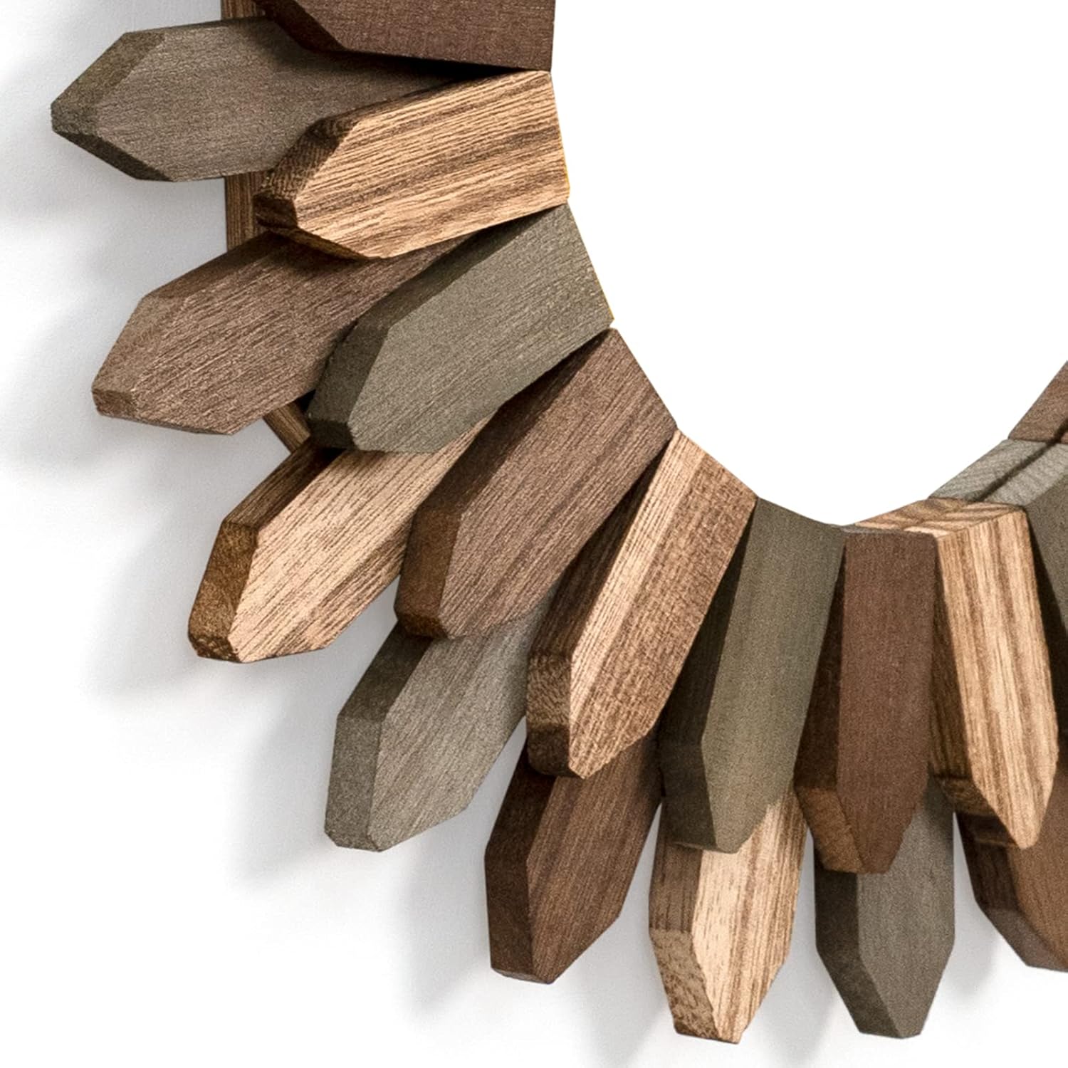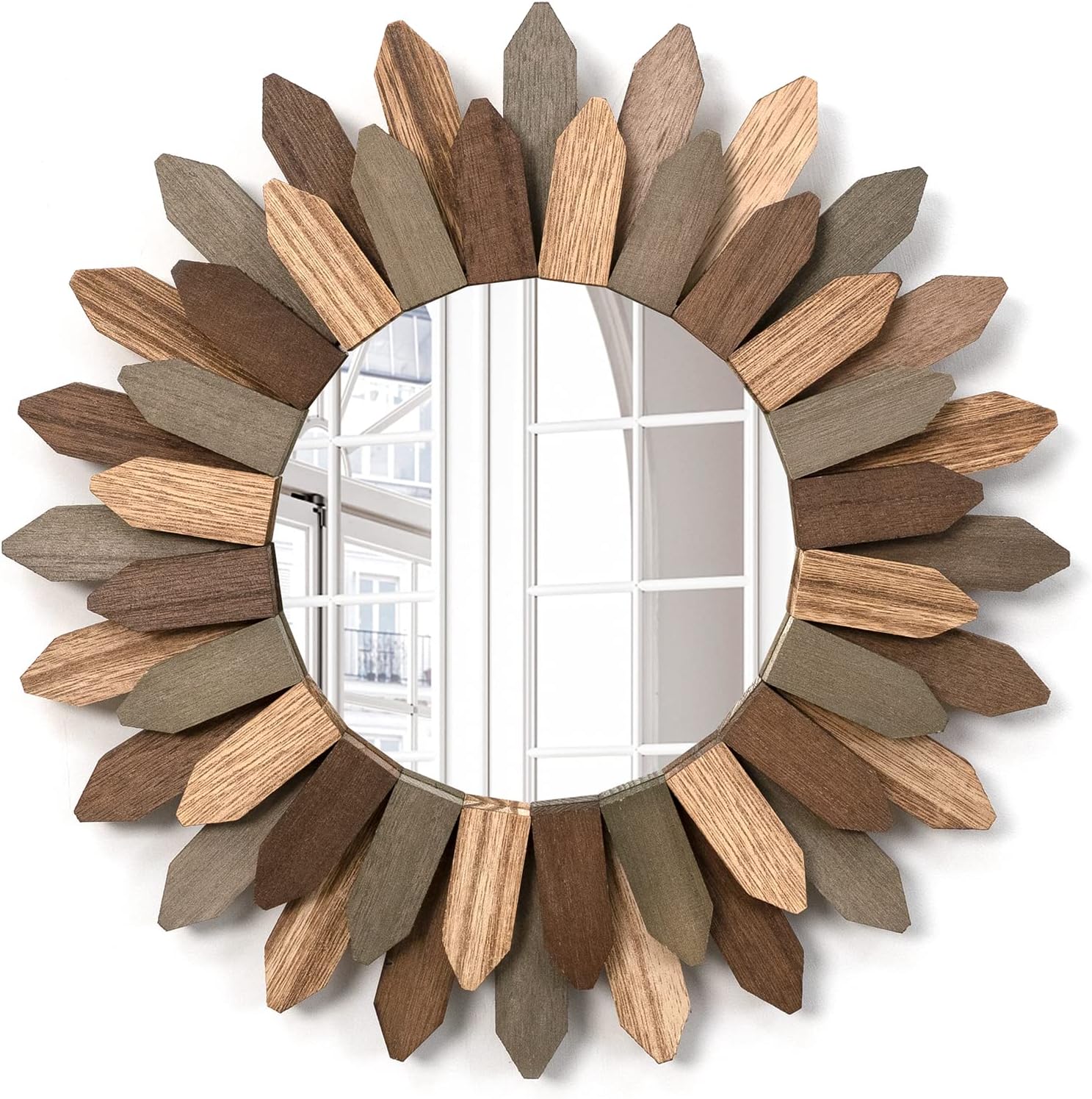 Emfogo Wall Mirror 12 inch Rustic Wood Sunburst Boho Mirror Farmhouse Wall Decor Room Decor Home Decor for Bedroom Living Room Entryway (Tri-Color)