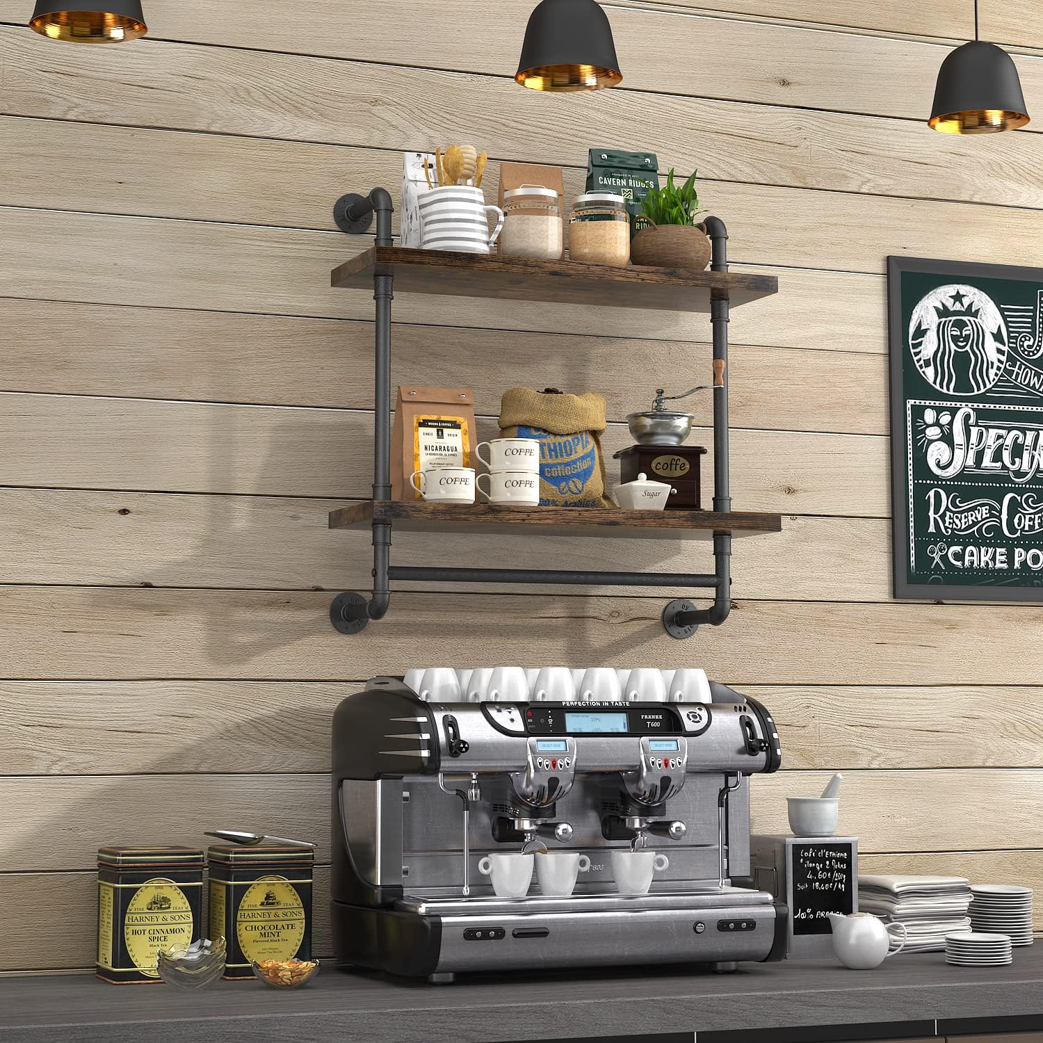 Helsin 24inch Industrial Pipe Shelving Bathroom Shelves Wall Mounted with Towel bar, 2 Tier Rustic Wood Floating Shelf, Metal Towel Rack Wall Shelf for Home & Bathroom (Brown, 24inch)