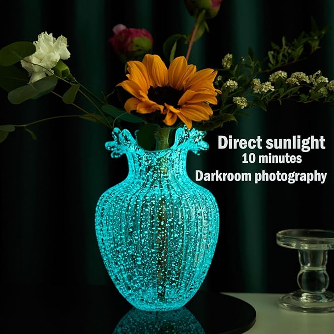 - 🌻【Luminous Vase】 The vase is clear during the day time or under lights, but glows when the surroundings become dark after the lights are turned off at night. PS: Our vase is made of glass and luminous stone,When it is placed indoors, it absorbs natural light or electric lights light, it will emit a faint blue light when the lights out at night. But if you leave the vase in direct sunlight for half an hour, it will emit a bright blue light in the dark.