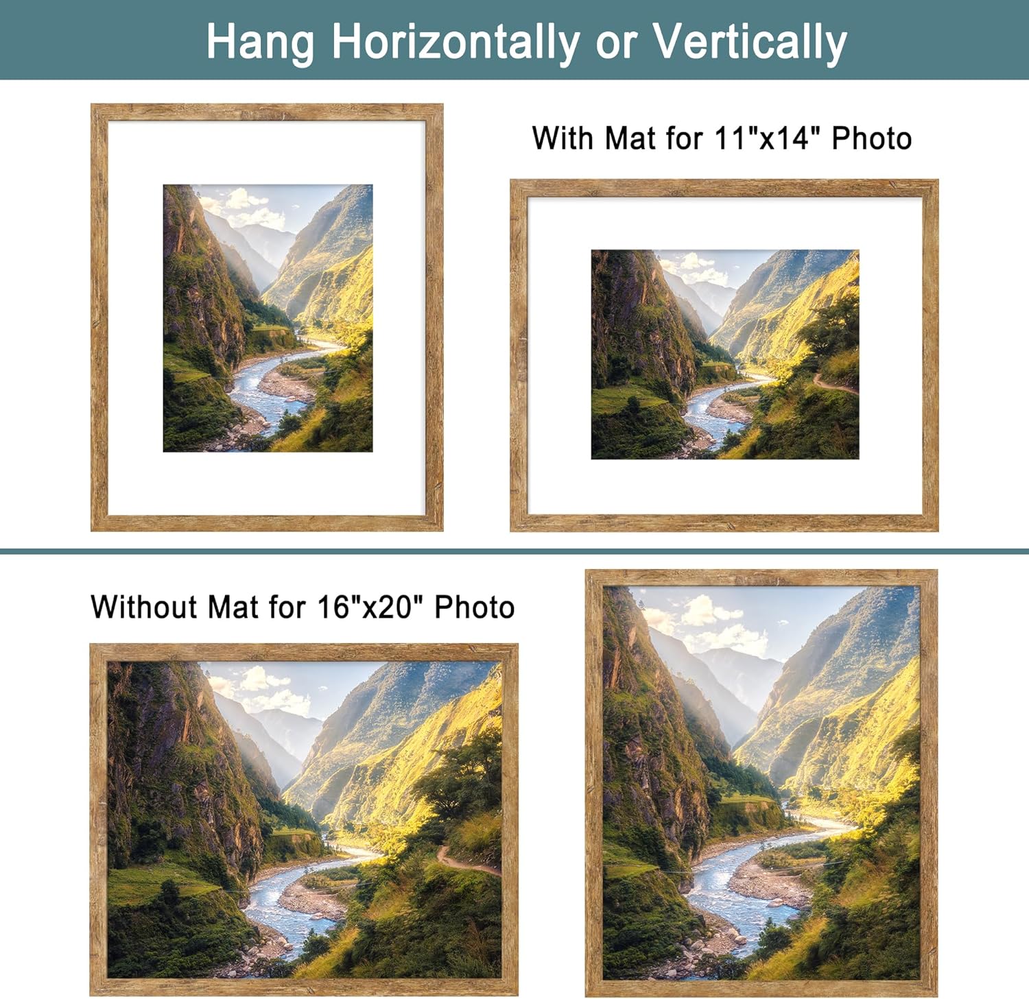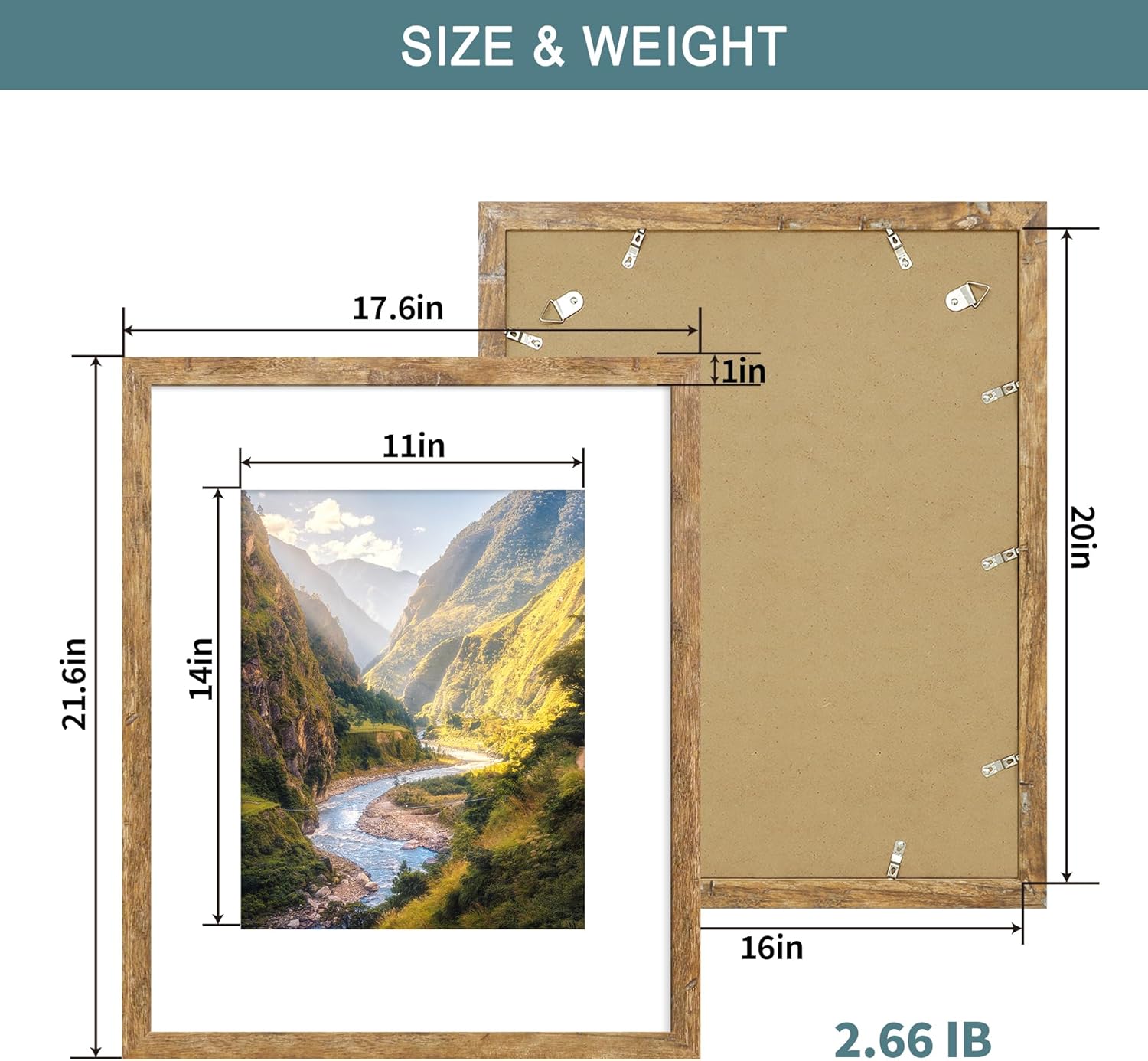 - Double Frames Set: Includes 2 frames in the same size. Perfectly fits 11x14 inch pictures with mat or 16x20 inch without mat. The frame opening display size is 0.5 inches smaller than the photo size for secure mounting.