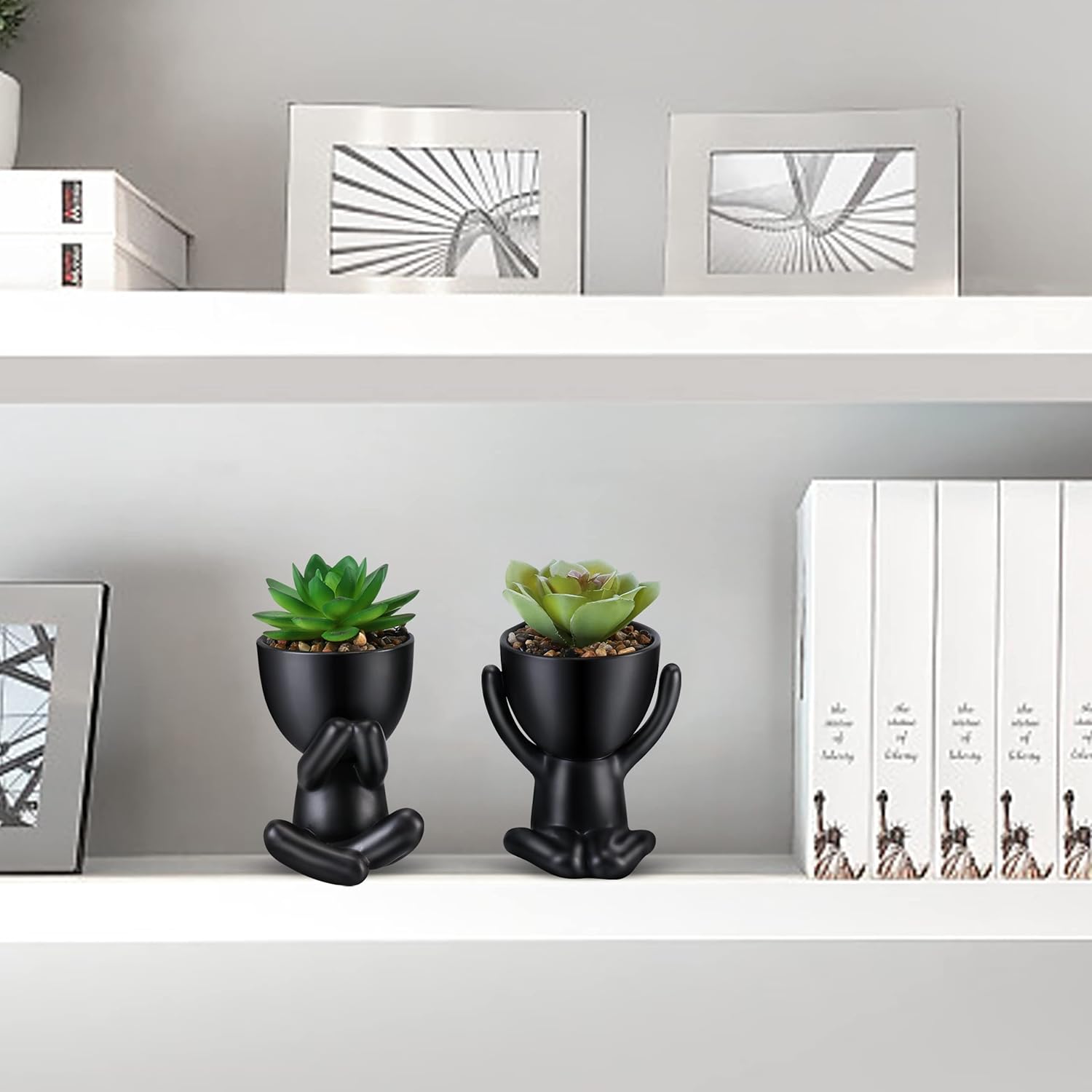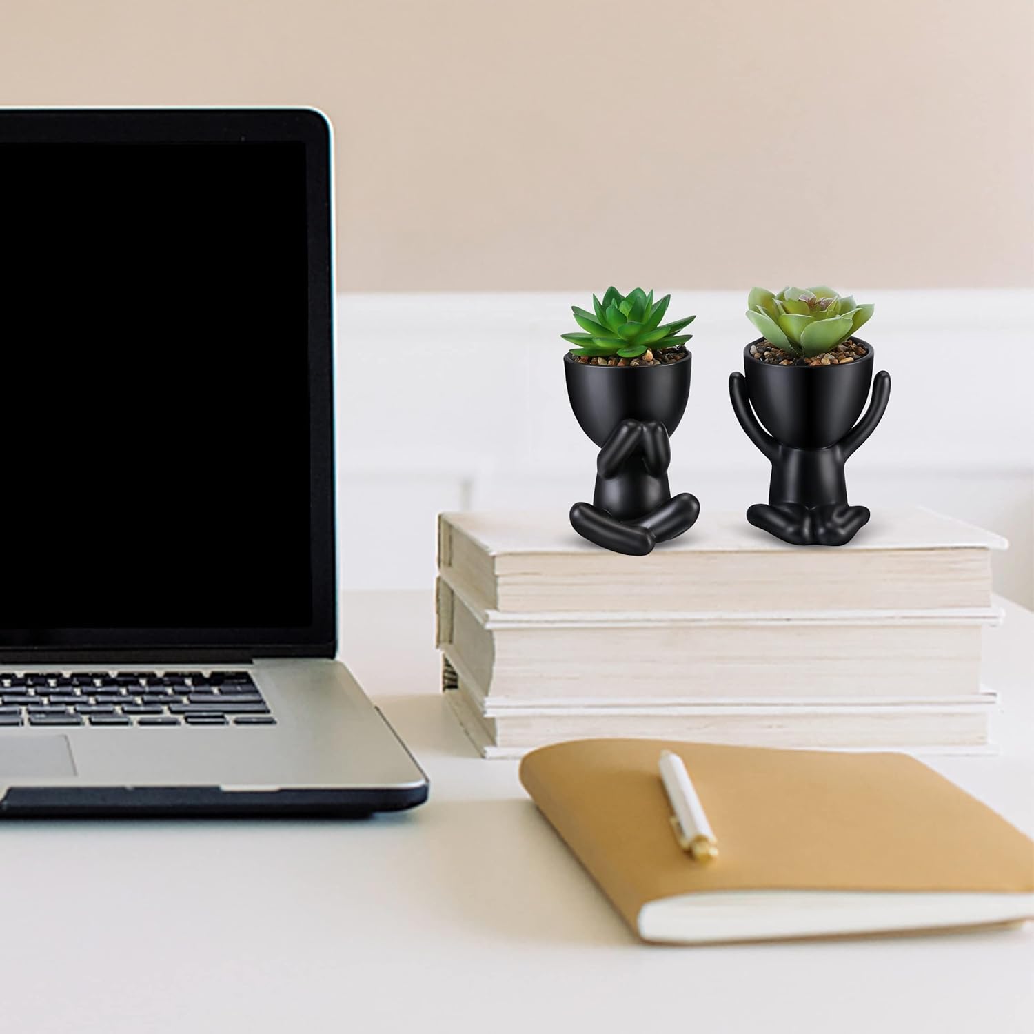 Fake Succulent, Mini Succulents Plants Artificial in Black Modern Human Shaped Ceramic Pots Desk Decor Desk Plant for Office Decor for Women, Cute Fake Plants Bathroom Decor 2PCS