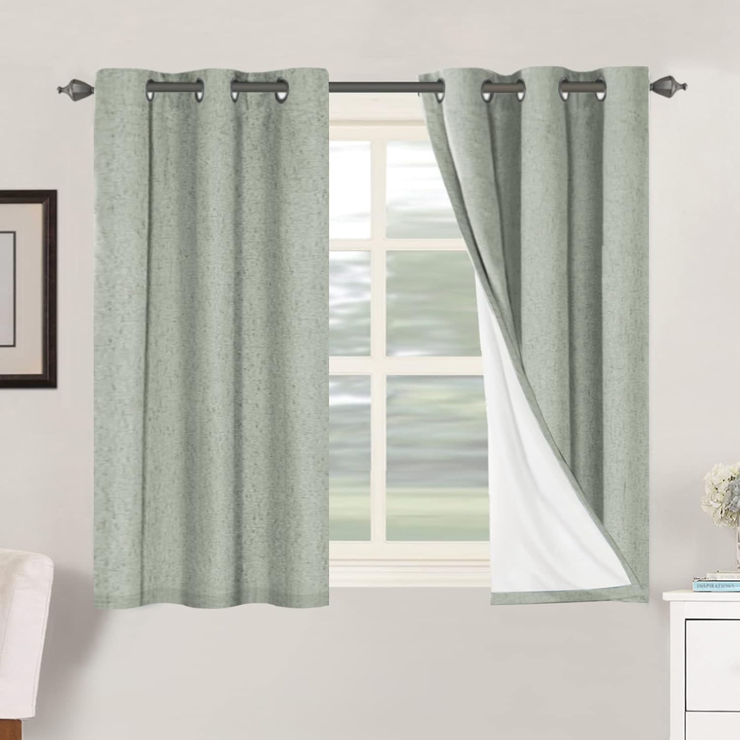 H.VERSAILTEX Primitive Linen Curtains 100% Blackout Curtain Drapes Burlap Fabric Curtains with White Thermal Insulated Liner, Grommet Top Drapes Living Room/Bedroom (2 Panels, 42 x 45 Inch, Sage)
