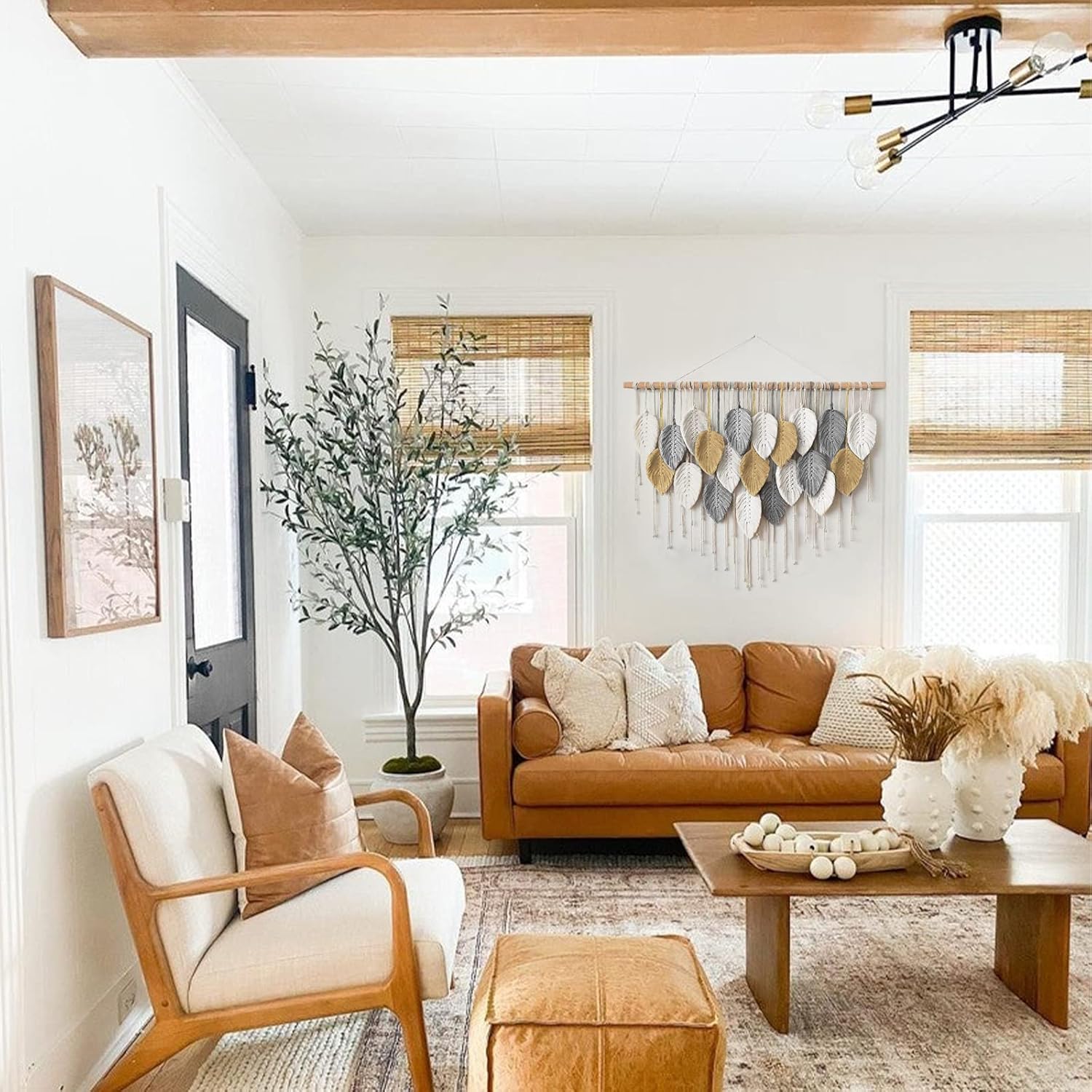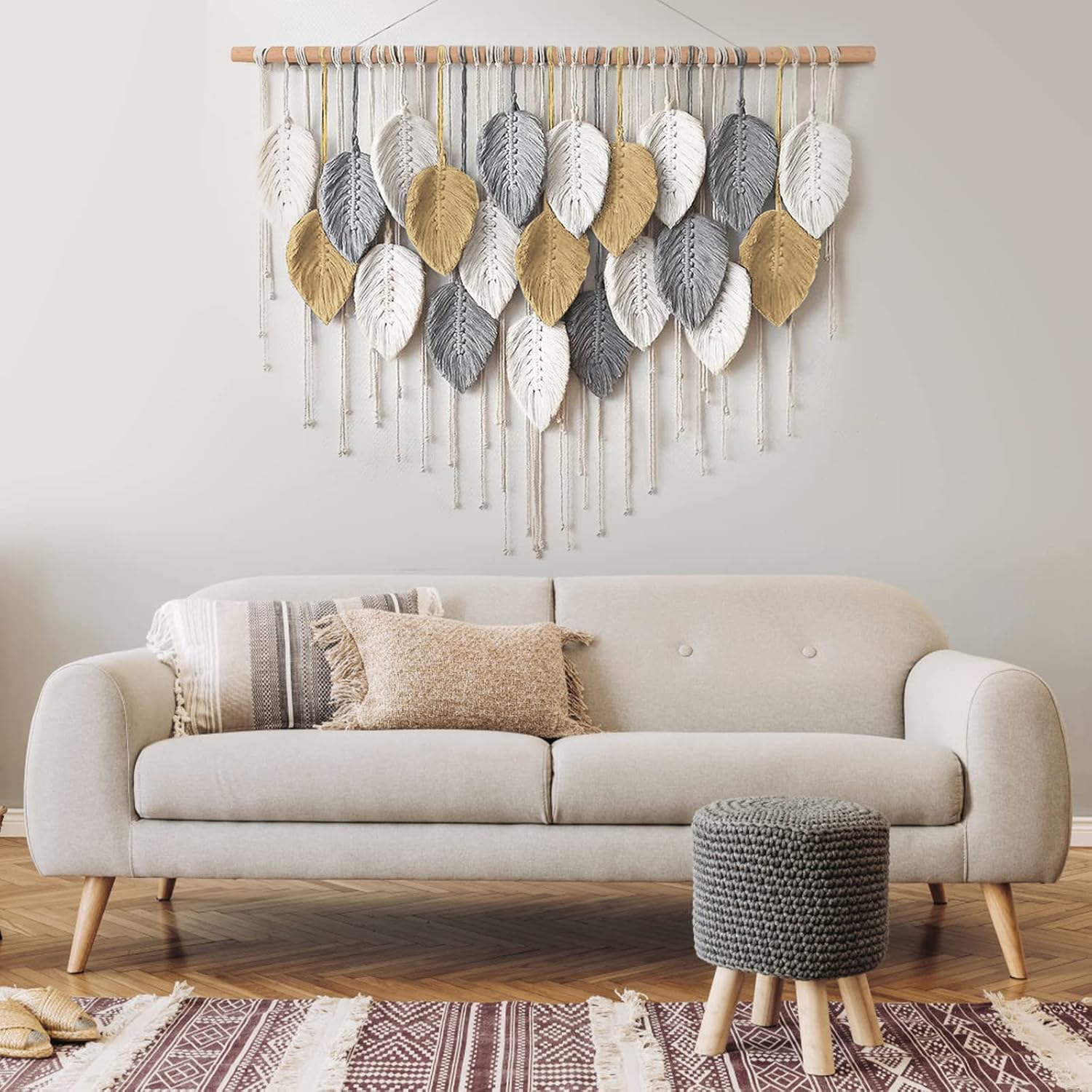 - 【Premium Quality Macrame】: Unique boho room decor, this meticulously woven wall hanging macrame with beautiful weaving leaves is made of natural rope,which knotted on the wooden dowel,and features fringe accents.