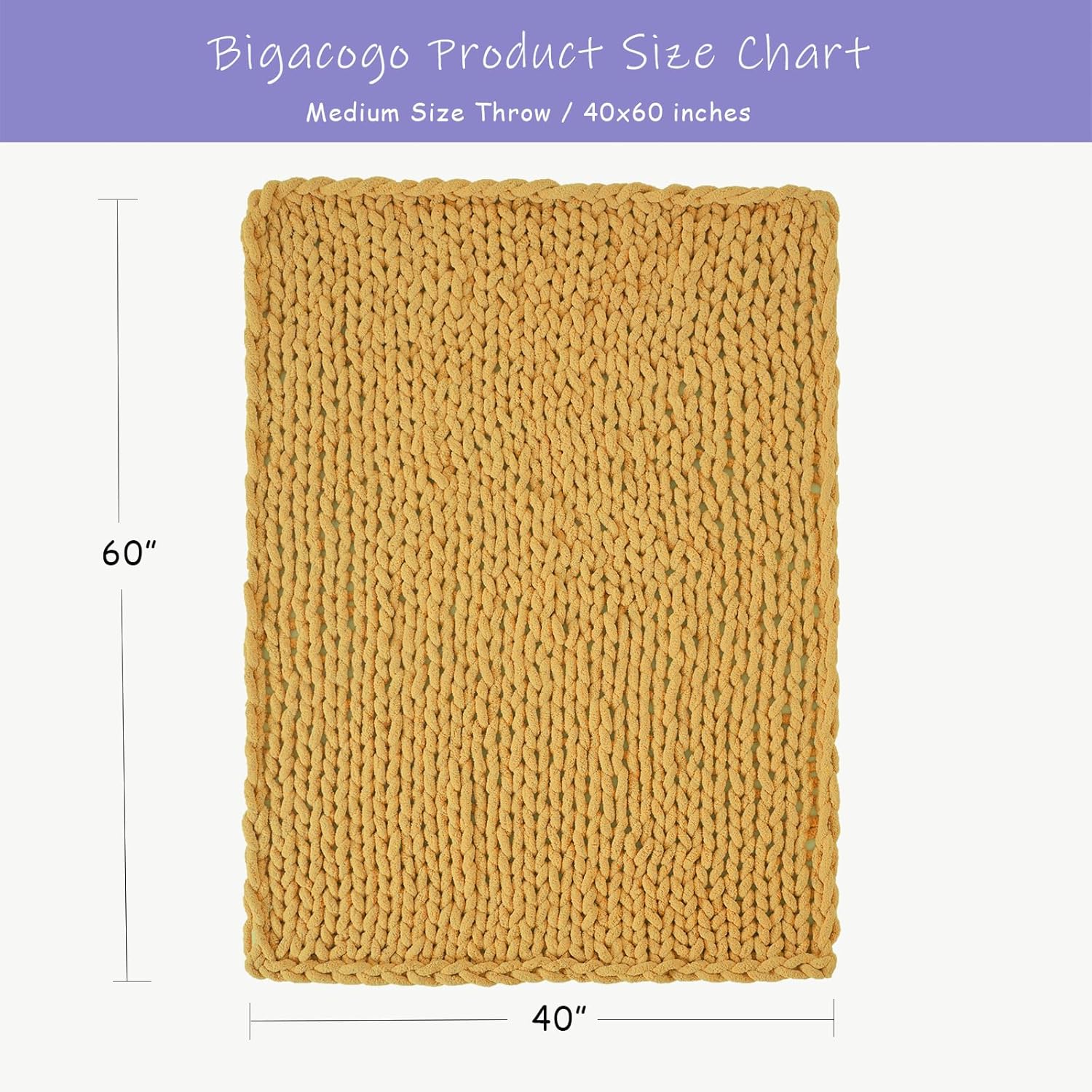 Bigacogo Chunky Knit Throw Blanket for Couch, 40x60 inches, 100% Hand Knitted with Thick Jumbo Chenille Yarn, Cozy Soft Large Rope Knot Cable Crochet Blankets for Sofa Bed Living Room, Mustard Yellow