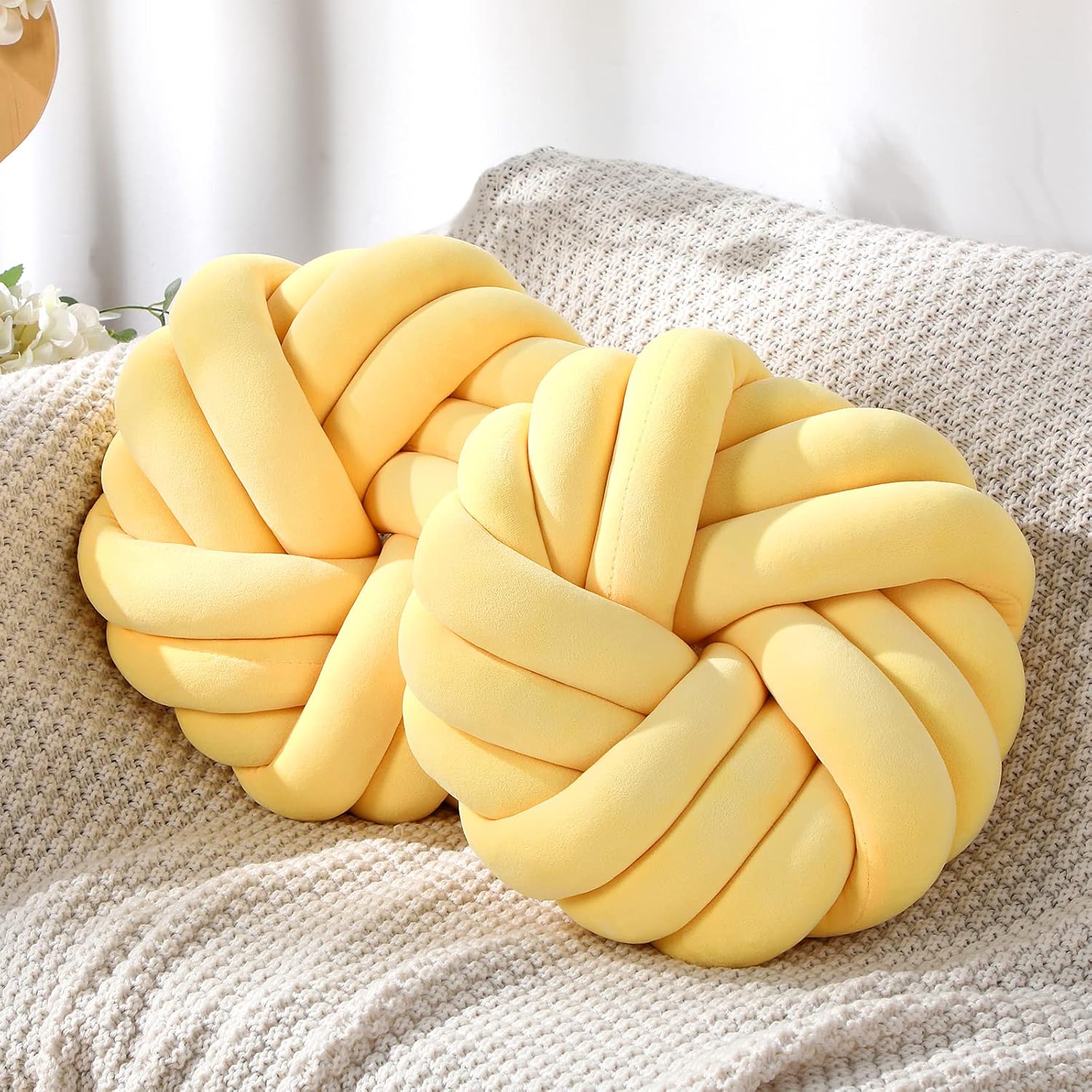 Fumete 2 Pcs 14 Inches Knot Pillow Round Throw Soft Plush Knot Ball Pillow Handmade Knotted Modern Home Decorative Cushion for Bed Bedroom, Sofa, Couch (Yellow)
