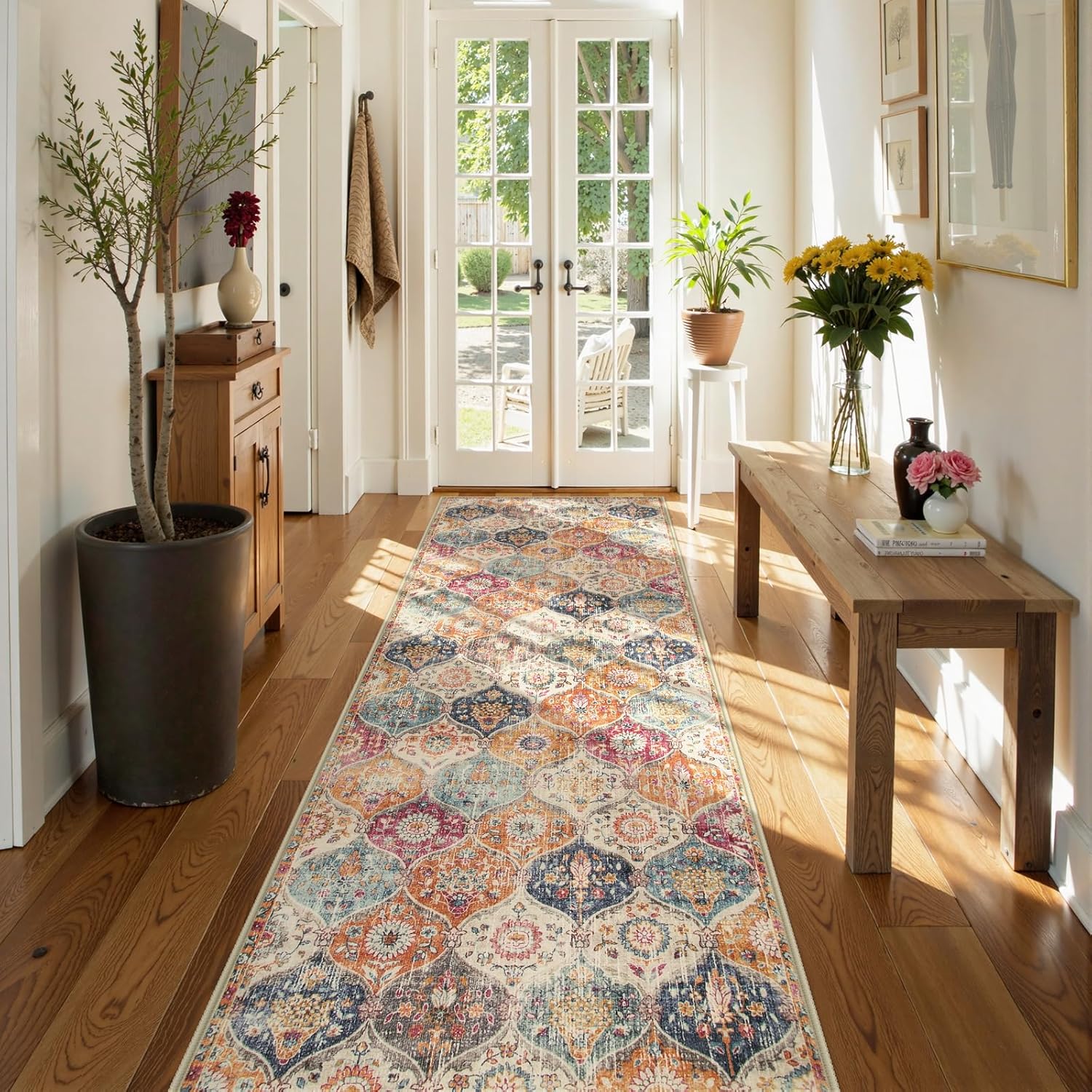 Lahome Moroccan Hallway Runner Rug, 2'5''x8' Ultra-Thin Washable Runners for Hallways Kitchen, Oriental Laundry Room Rug Non-Slip Vintage Long Carpet for Entryway Bedroom Bathroom, Cream/Multi