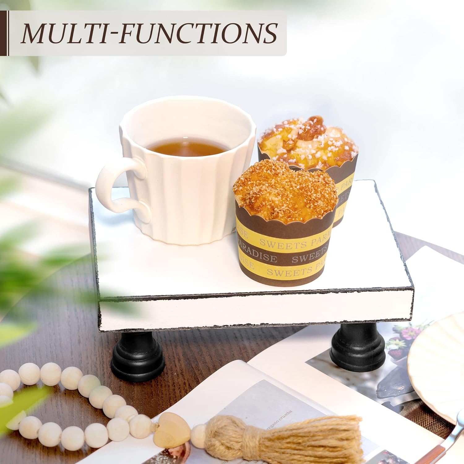 - [SIMPLY CHARMING AND STYLISH ROOM DECOR] The adorable wooden display stand is an amazing addition to any chic farmhouse decor! With distressed around its edges and painted surfaces, the riser is unique and suitable for long-term uses.