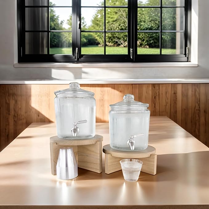 - Set of Two Tier Pedestal Stands: This set features two round pedestal risers - one tall stand with a 6" platform and one short stand with a low 3.75" platform. Both have a 10" circular tray top. Ideal for cake stands, raised plant stand for large heavy pots, or holding 1.5-gallon drink dispensers. For the best fit, we recommend measuring your space before purchasing!