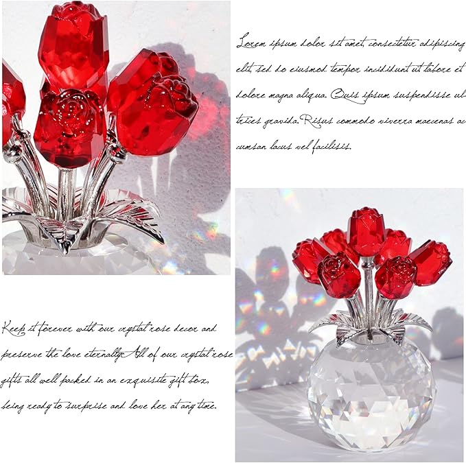 - EXCELLENT GIFT FOR HER: The wonderful crystal roses figurine will be an ideal gift for mum, wife, daughter, girlfriend, sisters, best friends, aunt, colleagues, and so on. Especially on some special occasions like Mother's Day, Anniversary, Birthday Party, Thanksgiving, Christmas, Wedding and Engagement etc. To surprise her bringing happiness and good luck