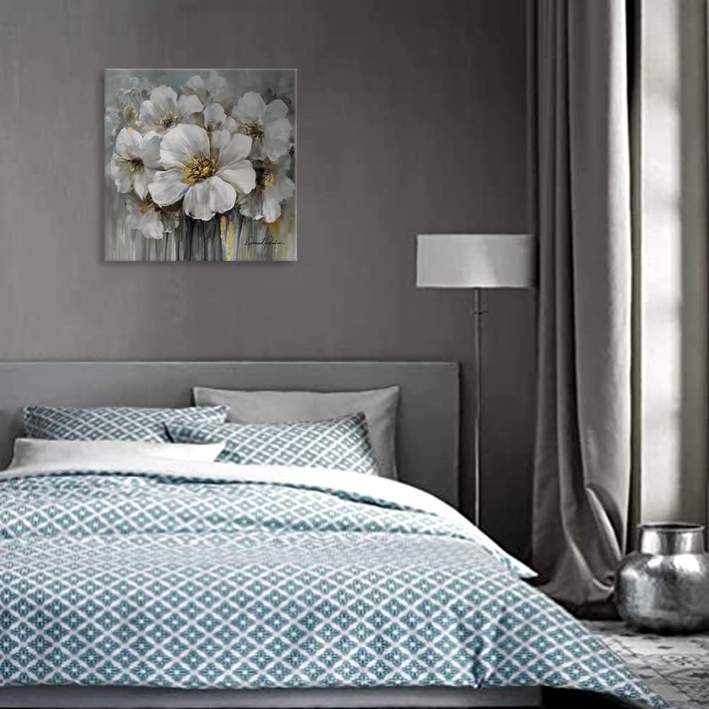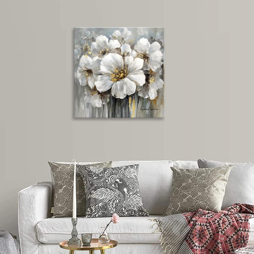 Living Room Flower Picture Wall Art White Floral Painting with Gold on Canvas for Gray Bedroom Decor 30" x 30"