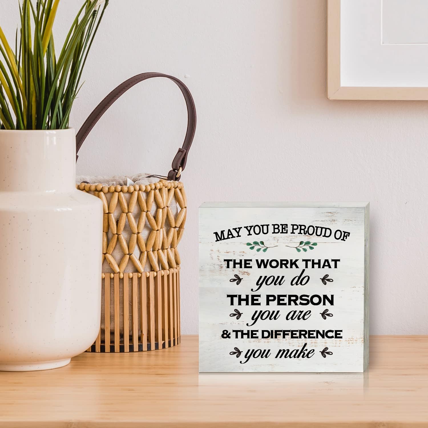 May You Be Proud of the Work Wood Box Sign Decor Rustic Employee Wooden Box Sign Block Plaque for Wall Tabletop Desk Home Office Decoration 5" x 5", Thank You Gift