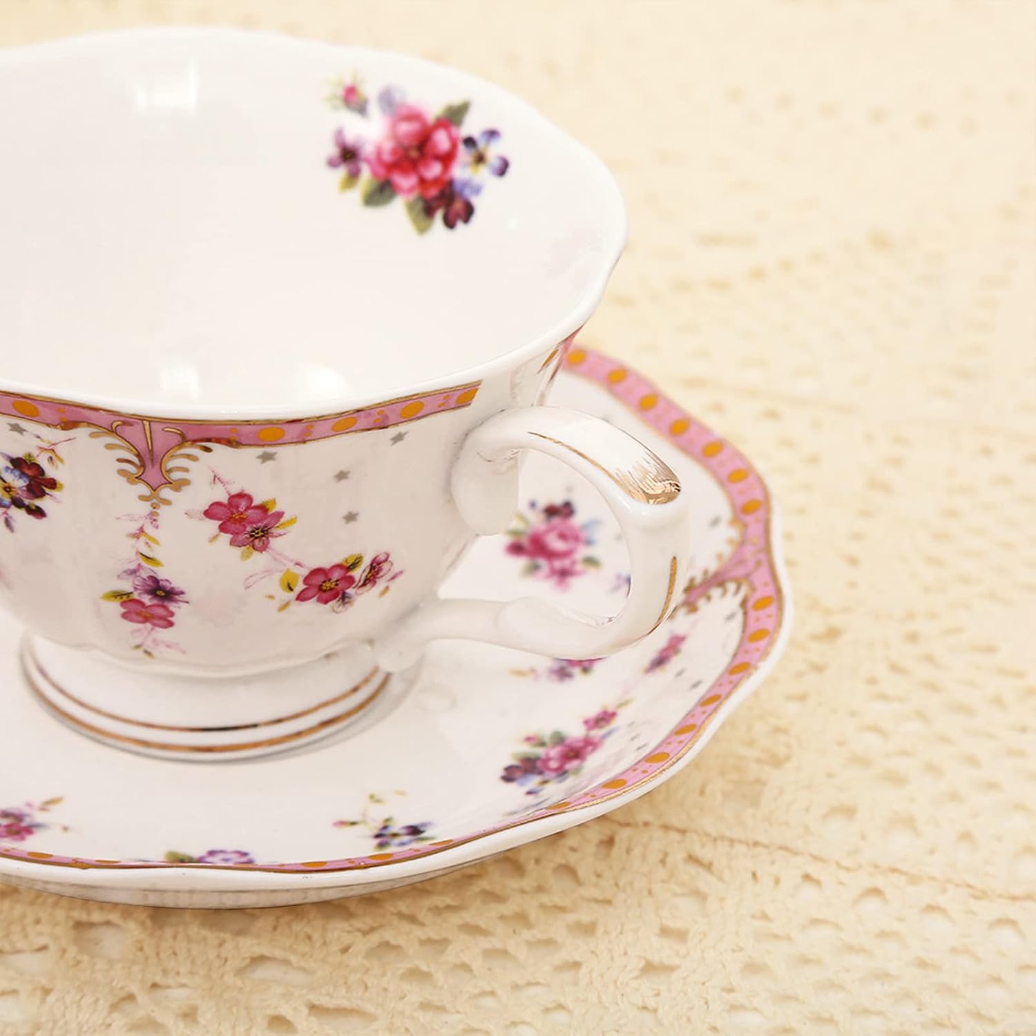 - WIDE USE: Decorative gold trim makes the pink cappuccino cup more vintage and elegant. Petal edge adds a lively touch. Not just a coffee cup, but the perfect companion for breakfast
