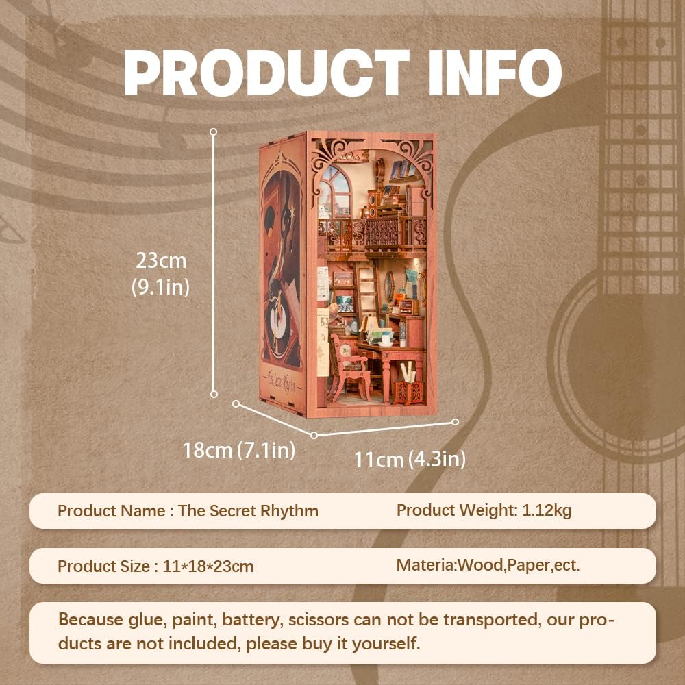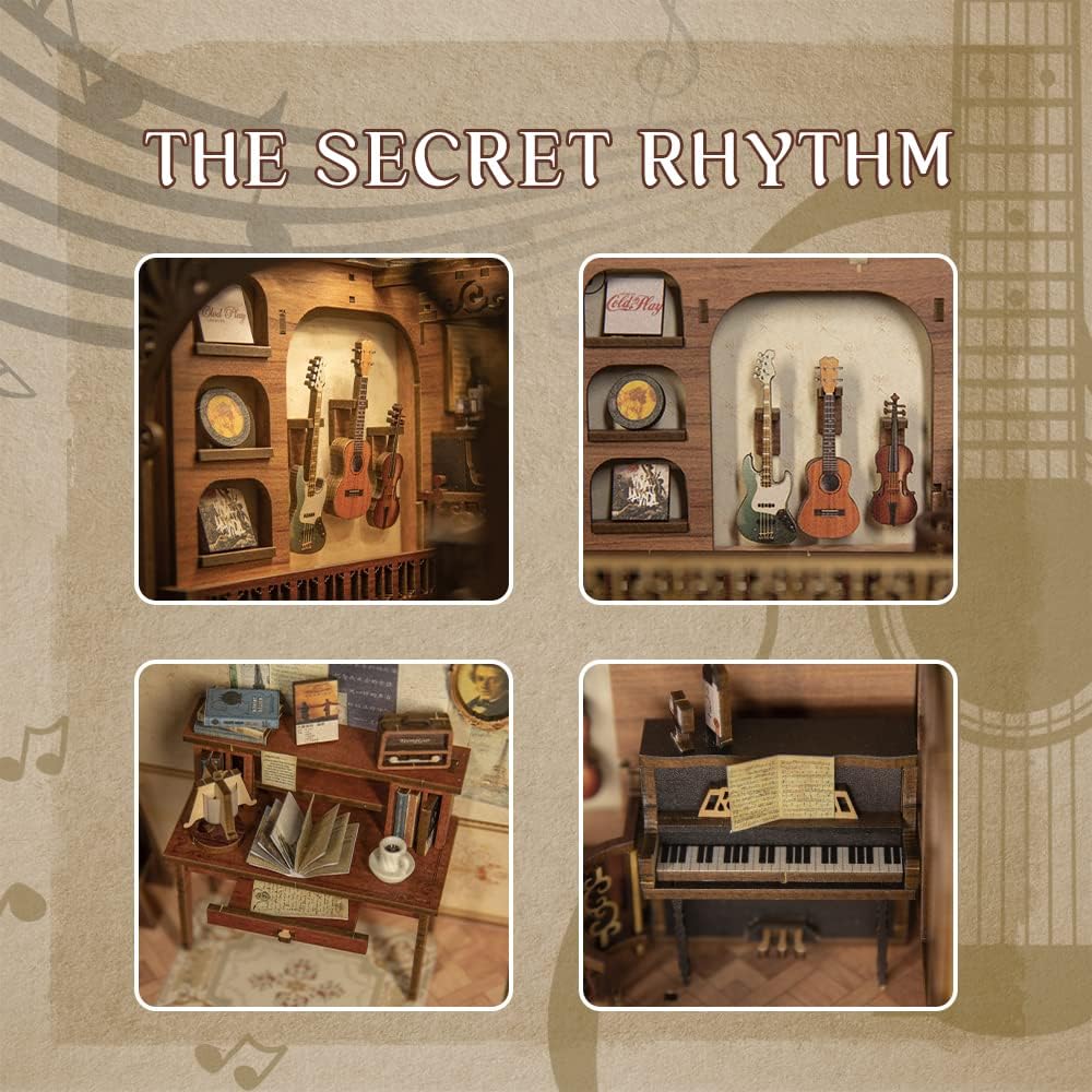 - 【DIY Book Nook Kit-UNIQUE DESIGN CONCEPT】The European classical design takes you on a musical trip. The top and bottom of the book nook reflect a sense of hierarchy; a quick touch switch creates convenience; lighting, furniture, and specific music components decorate to display a sense of full of details, such as guitars, phonographs, records, and so on.