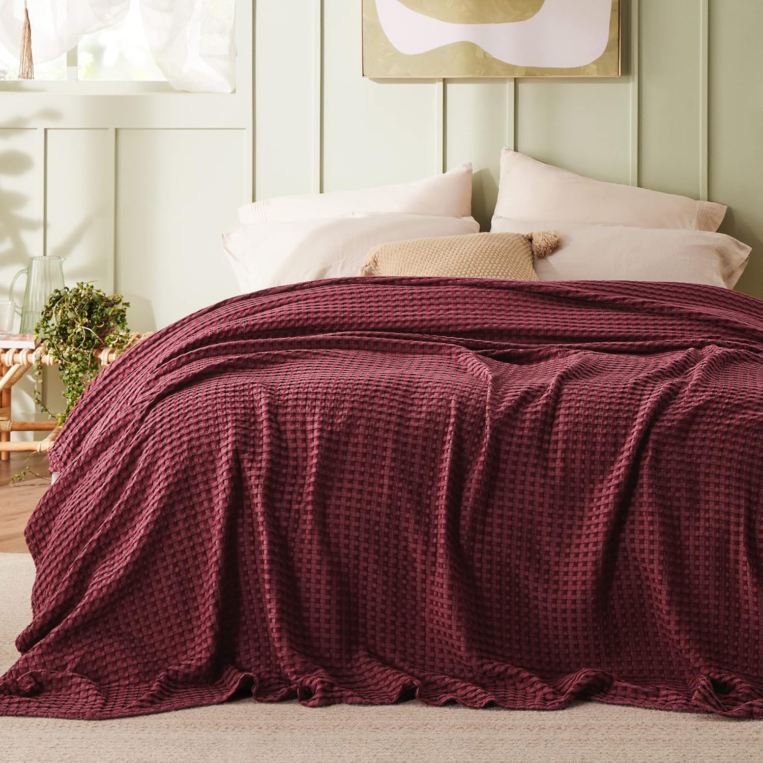 Bedsure Cooling Cotton Waffle King Size Blanket - Lightweight Breathable Blanket of Rayon Derived from Bamboo for Hot Sleepers, Luxury Throws for Bed, Couch and Sofa, Burgundy, 104x90 Inches