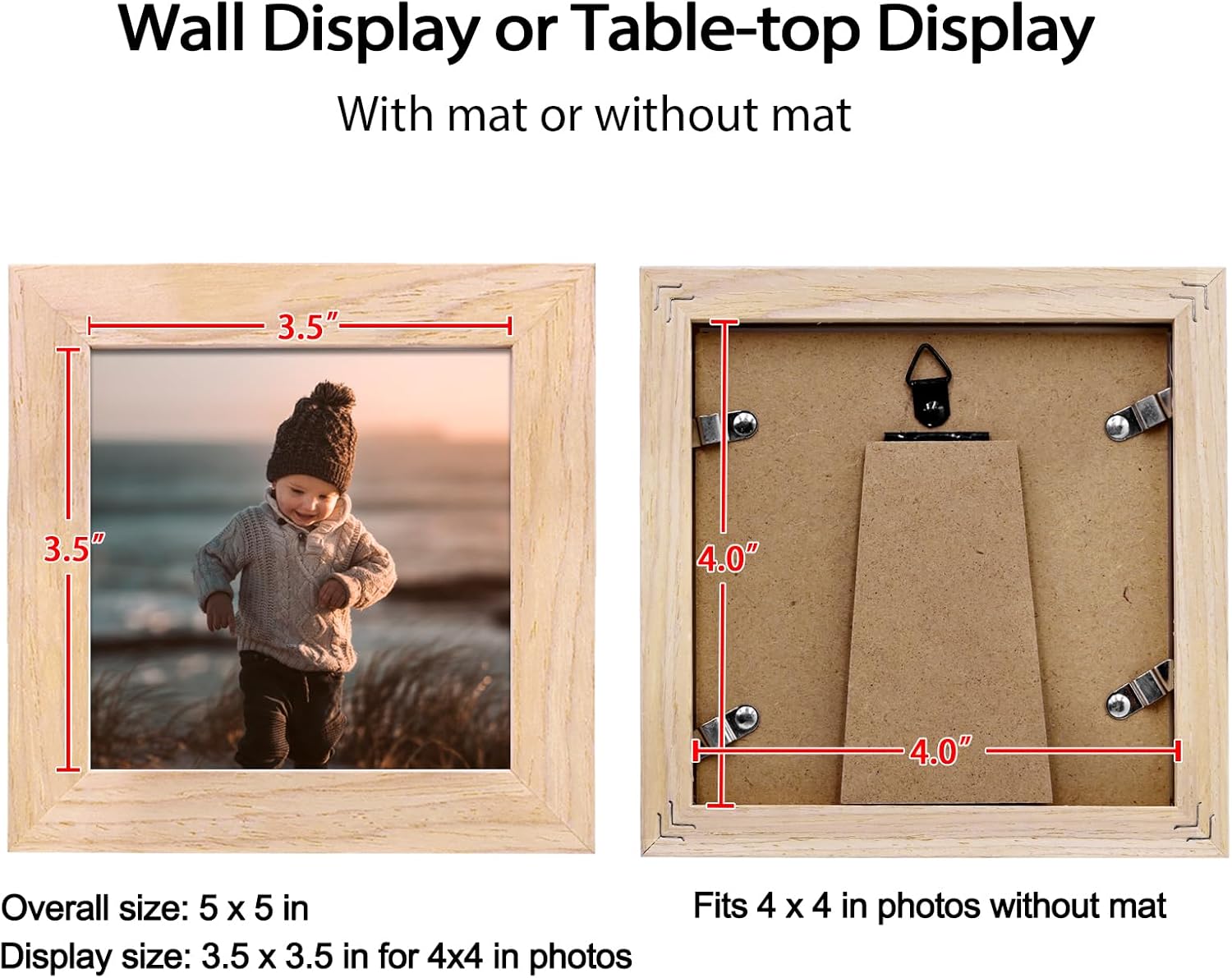 KINLINK 4x4 Picture Frame, Natural Square Solid Wood Frames for Pictures 4x4 without Mat, Wall and Tabletop Display Photo Frames Natural Wood 4 Pack