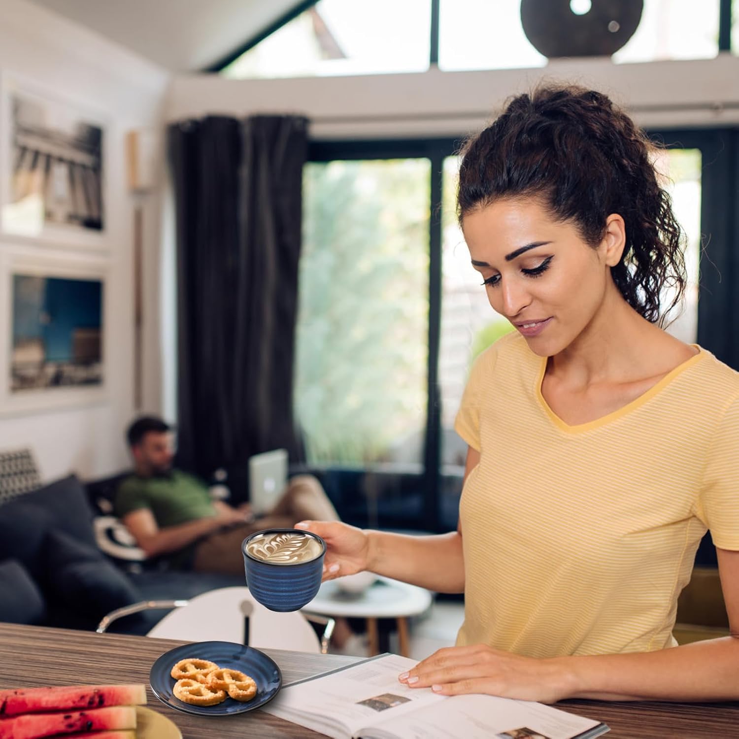 Hasense Espresso Cups Set of 4, 4 Ounce Ceramic Cappuccino Cup with Saucers, Small Coffee Mugs for Espresso Shots, Cappuccino, Tea, Latte, Demitasse, Navy Blue