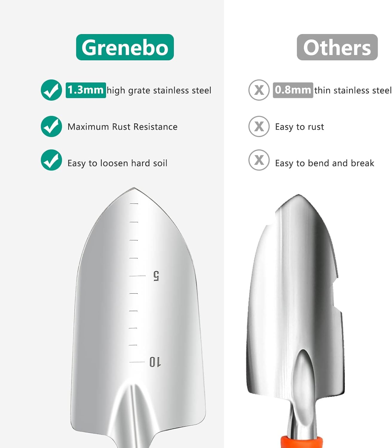 - One for All Package: Grenebo garden tools set includes a total of 8 tools and 1 storage bag. Pruning Shears, Weedier, Transplanter, Cultivator, etc., nearly everything you need in daily garden maintenance.