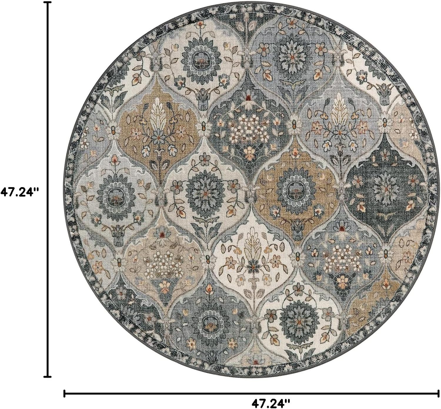 Lahome Moroccan Trellis Washable Round Rugs, Non-Slip Soft Round Rug 4ft Ultra-Thin, Small Vintage Circle Carpet for Entryway Kitchen Bedroom Nursery Bathroom, Grey