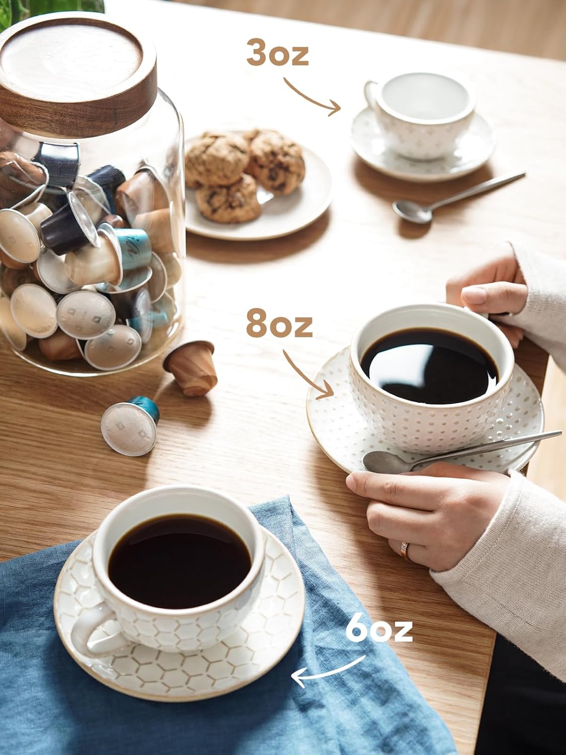 - Ideal Cups Of Demitasse: Each Cup: Dia:3", H:2.1". Capacity(normal): 3 oz / 120ml. Each saucer: Dia: 4.5", H: 1". Round bottom profile allows a fuller flavor to develop, and it is easy for the barista to make latte art designs. The thick wall maintains the flavor and keeps the coffee warm