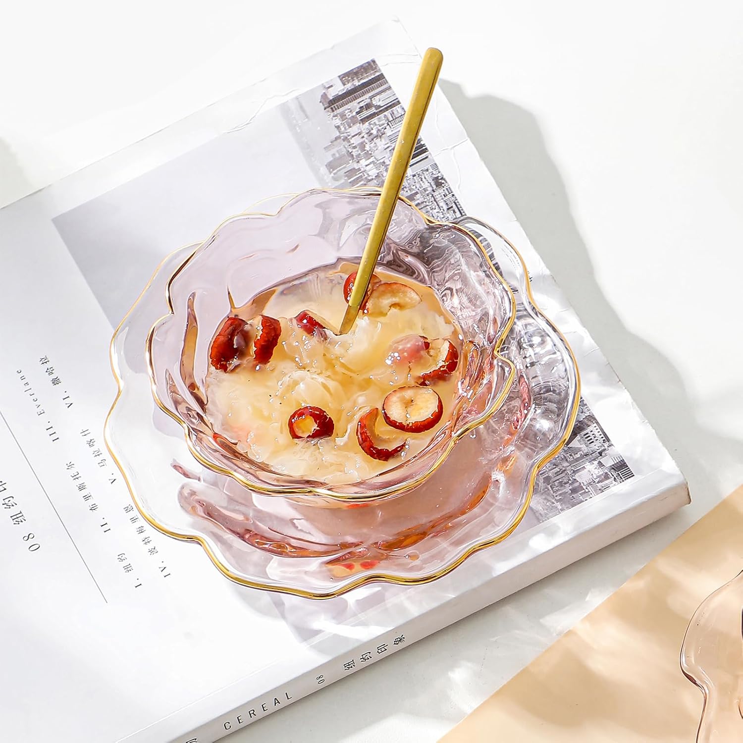 - Unique design: The beautiful gold rimmed glass dessert plate is in the shape of a rose, pink and looks beautiful, simple and delicate, the desert glass plates are decorated with gold rims. The crystal-like glass texture can be a decoration on your table, adding a touch of color to your life.